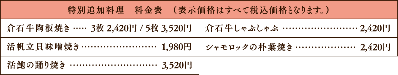 上質な特別追加料理季節の和食膳とは別に、特選素材を使った上質な特別追加料理をご用意できます。新鮮な食材を使用し、ひとつひとつ丁寧に仕上げてあります。夕食をより華やかにする演出に是非ご利用ください。