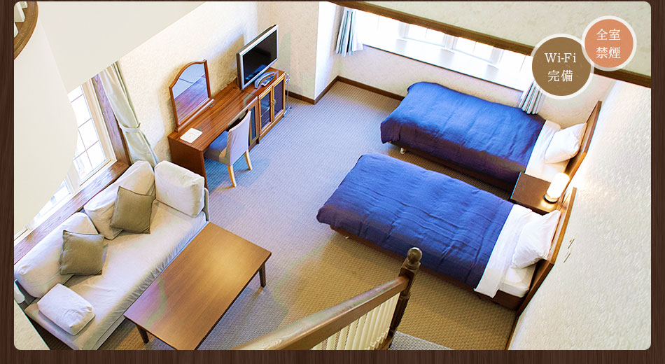 2階建てのメゾネットタイプのお部屋を優雅に使う、デラックスルームはお洒落な内装のワンランク上のお部屋。素敵な空間をゆったりのんびりお過ごし下さい。