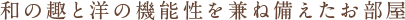 和の趣と洋の機能性を兼ね備えた和洋室をグレードアップ。お洒落な内装がお部屋を綺麗に彩ります。ちょっと大人な落ち着いた雰囲気の中、やすらぎの空間をご家族やお友達でお楽しみください。