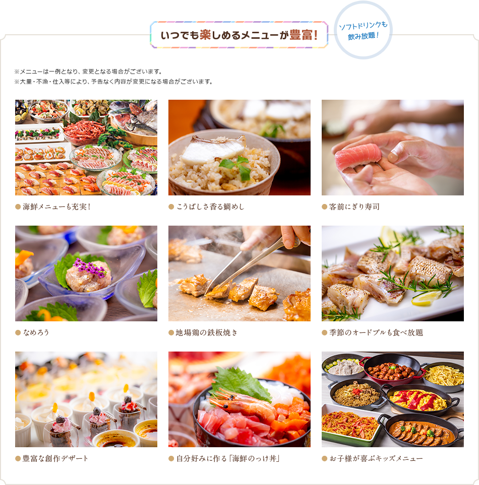 ※掲載の料理写真はイメージです。 ※ご予約の状況により、バイキングからハーフバイキングに変更する場合がございます