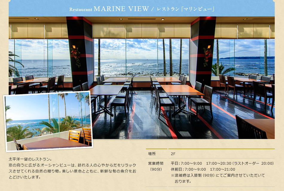 太平洋一望のレストランで、景色を眺めながらゆっくりとお召し上がりください。朝食は、和洋バイキングとなります。