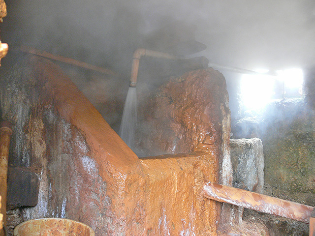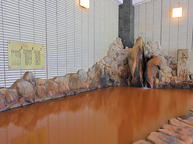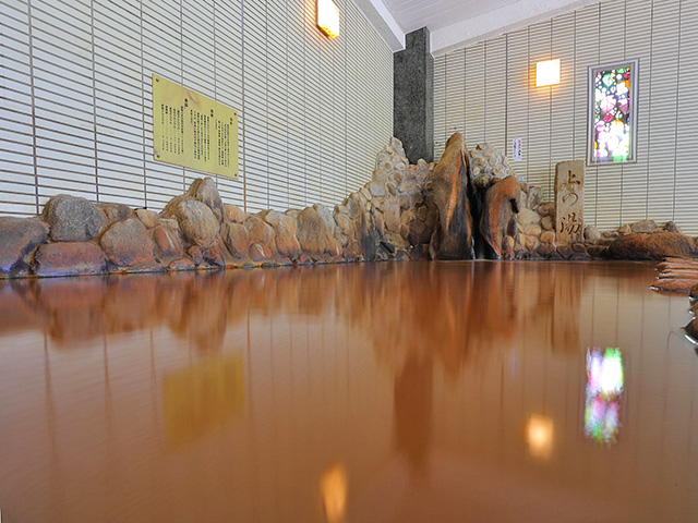 特徴的な赤褐色の「金泉」は、鉄分と塩分を豊富に含み、その塩分が肌に付着して薄い膜を作るため、保温・保湿効果に優れています。