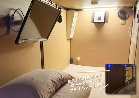 さらに、全カプセルルームのマットレスには純国産高級寝具の特注マットレスを導入。凹凸プロファイルマットレスの突起が体の血行を良くし、通気性にも優れているので、質の良い睡眠をとることが出来ます。
