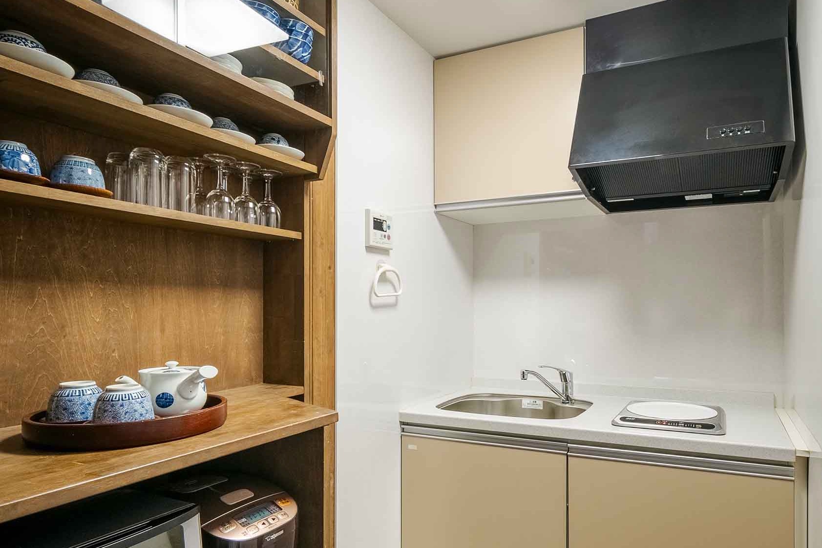 調理器具・食器類など充実のアイテムを備えたIHコンロ付のキッチン。錦市場で京都ならではの食材を揃えお料理もおすすめです。