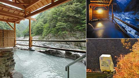 ホテルから約170メートル下の露天風呂まではケーブルカーでご案内。傾斜42度の断崖を、ゆっくりと下っていきます。 目の前を流れる祖谷渓谷。四季折々はもちろんのこと、昼下がり、夕暮れ時・・・と時間によっても見せる表情が異なります。 |