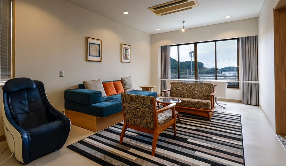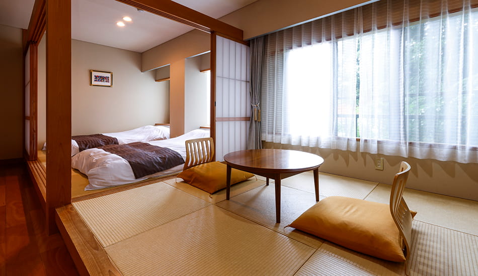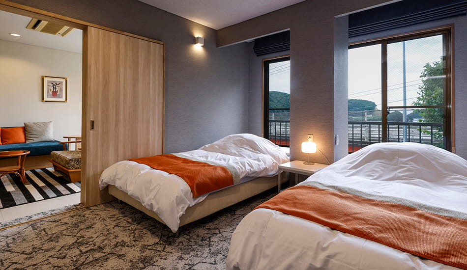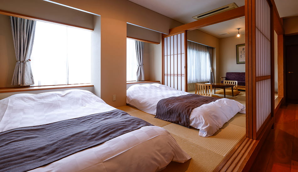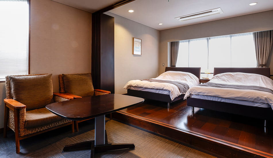 令和6年3月、温泉風呂にリニューアル。ブラウンを基調とした落ち着きある客室。ベッドスペースとリビングは折り戸で仕切ることができます。
