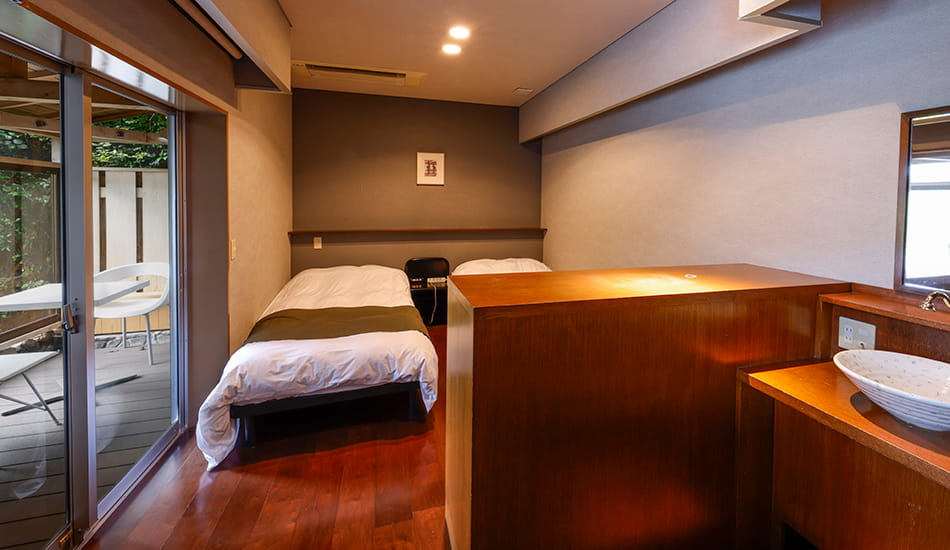 こじんまりとした客室はツインベッドの和洋室。檜を使用した露天風呂は大きめの浴槽です。