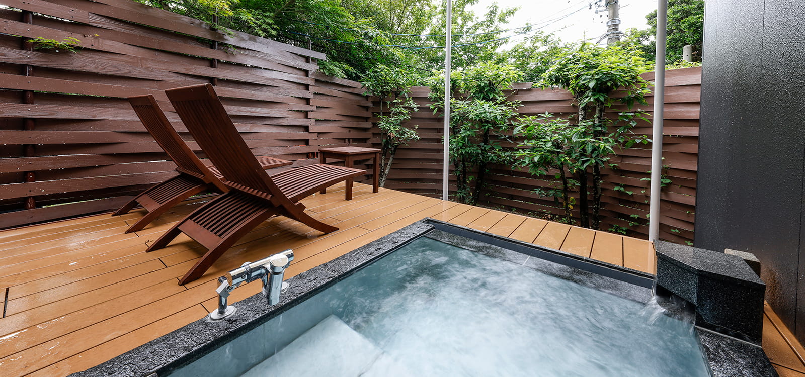 令和6年3月に温泉露天風呂付き客室にリニューアル。デッキ付の温泉露天風呂の他、内風呂もあり温泉が堪能できます。