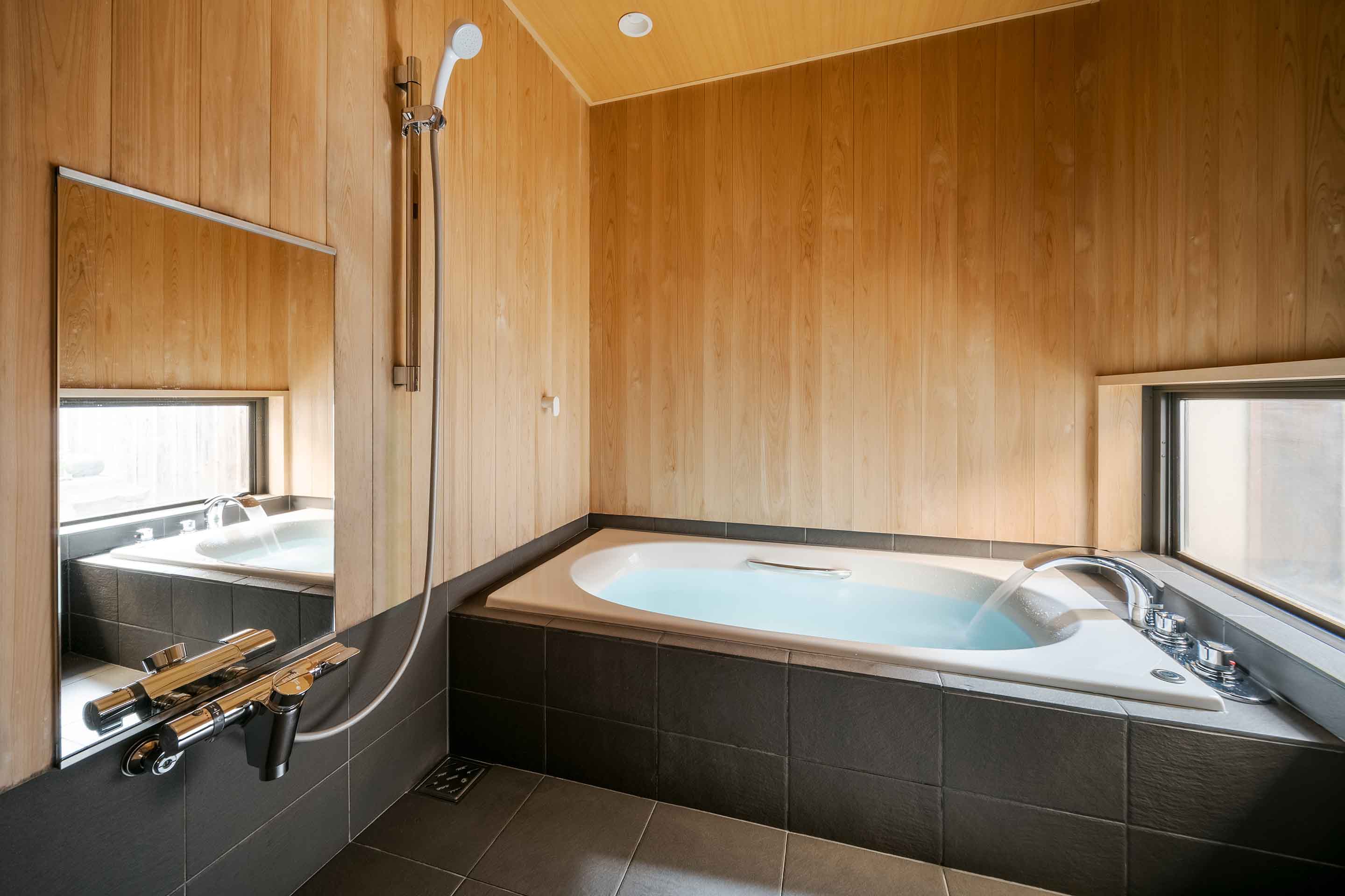 いい香りに包まれるヒノキの浴室。坪庭側には大き目の窓を設け、四季によって変わる景色を特等席でお楽しみください。