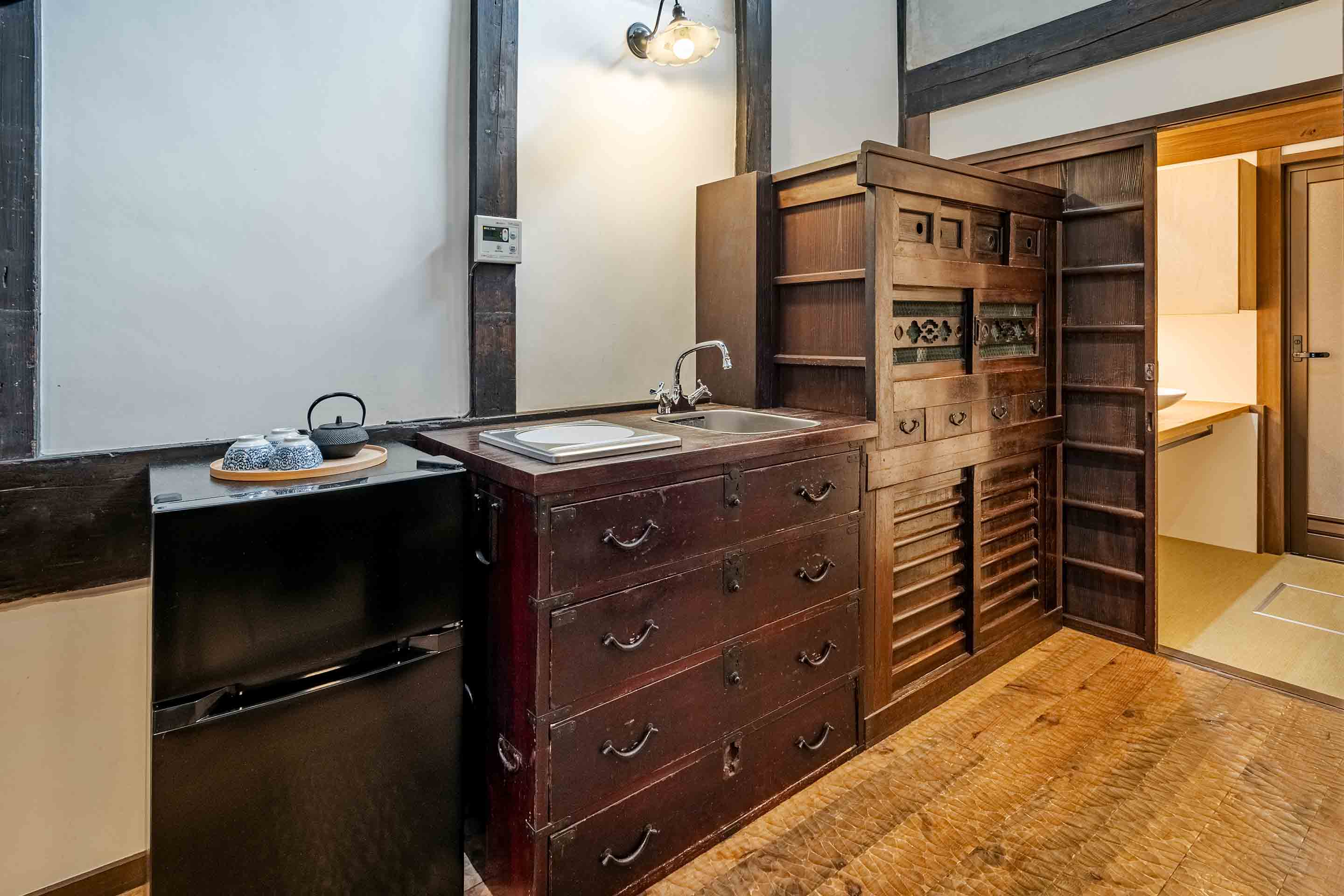 京町家の吹き抜け「火袋」から光の落ちるIHコンロ付きキッチン。食器類、調理器具も揃え、京都の地元食材で、いつもと一味違うお料理をお楽しみいただけます。