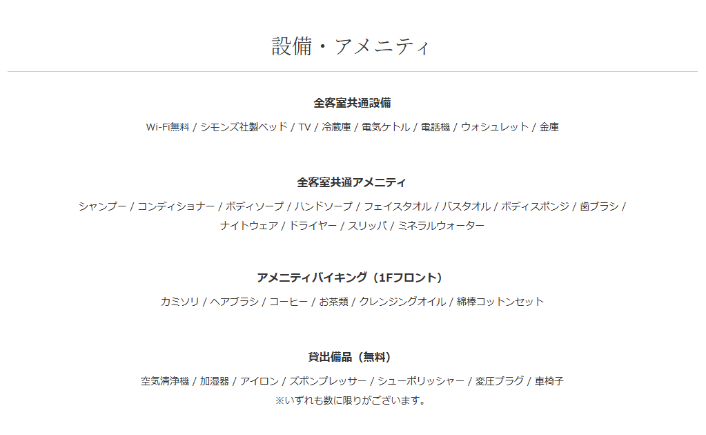 クレンジングオイル、綿棒コットンセット等、嬉しいアメニティが充実。詳細はこちら。