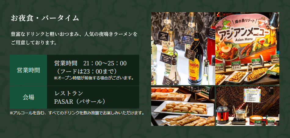 | 営業時間 | 17:00~20:00のフリー入場制 ※当日の宿泊者数により、複数の時間帯に分けてご案内する場合がございます。 |