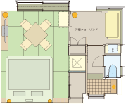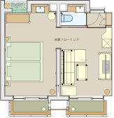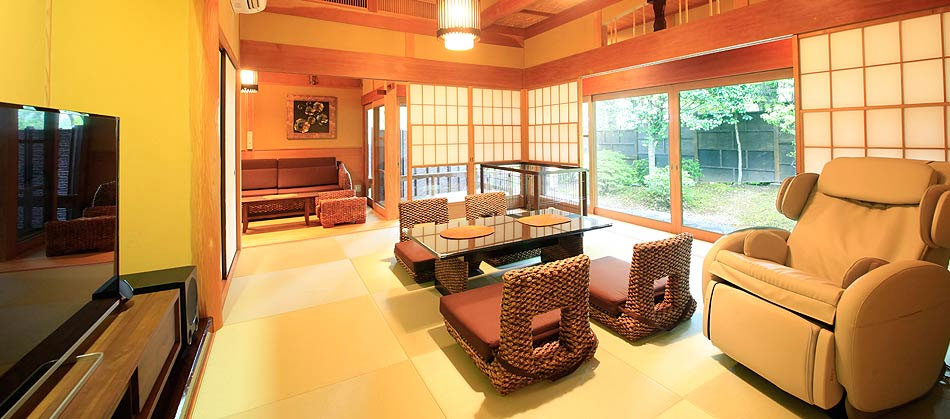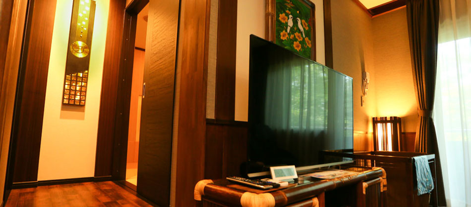 「和」と「バリ」の異なるアジアンテイストの調度品が並ぶ和洋室は、全室がプライベート性の高い角部屋仕様の造りでございます。