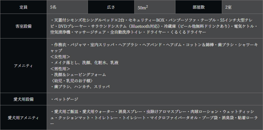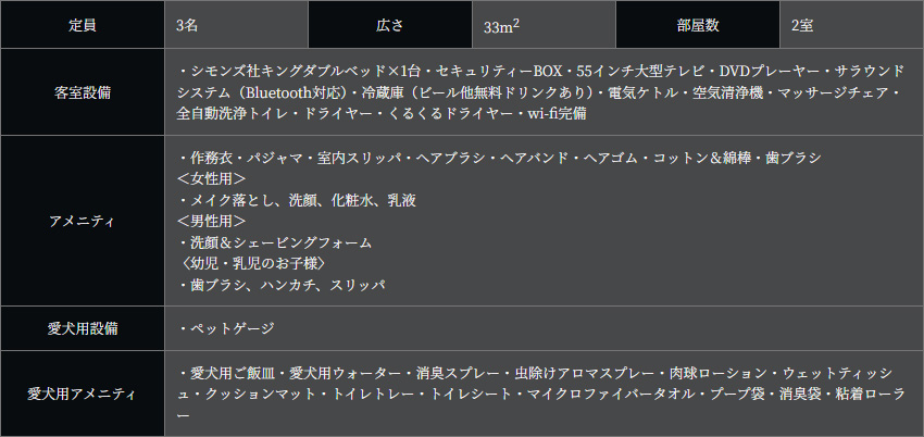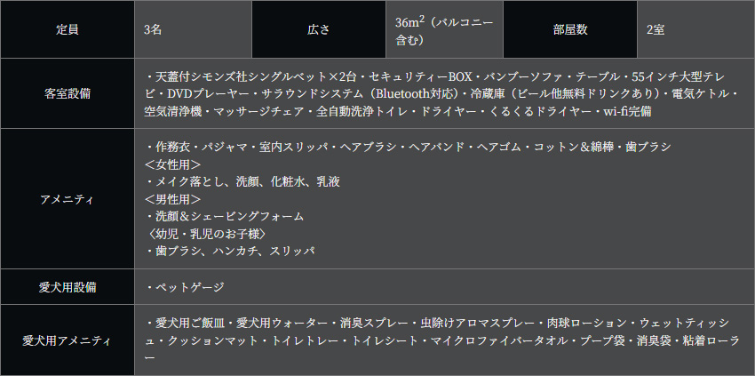 お部屋はモダンバリ風のリビングルーム・天蓋付きハリウッドツインの寝室に加え、愛犬も安心して寛げる琉球畳風の防水畳を使用した趣ある和室、 スイートルーム専用の内風呂を用意しております。