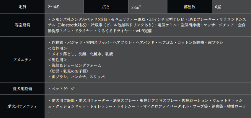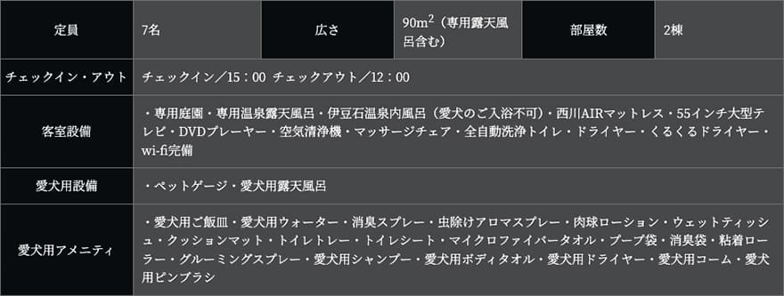 離れ家室内は防水畳の和室、ウォーターヒアシンスのソファのリビング、西川AIRマットレスを備えた寝室、伊豆石の内風呂、専用の露天風呂には愛犬用の露天風呂も備えております。和の趣のある塀で囲まれた庭園内は、愛犬を自由に遊ばせられます。テラスのリクライニングチェアで寛ぎながら小鳥の囀りと愛犬の楽しむ姿をお愉しみくださいませ。