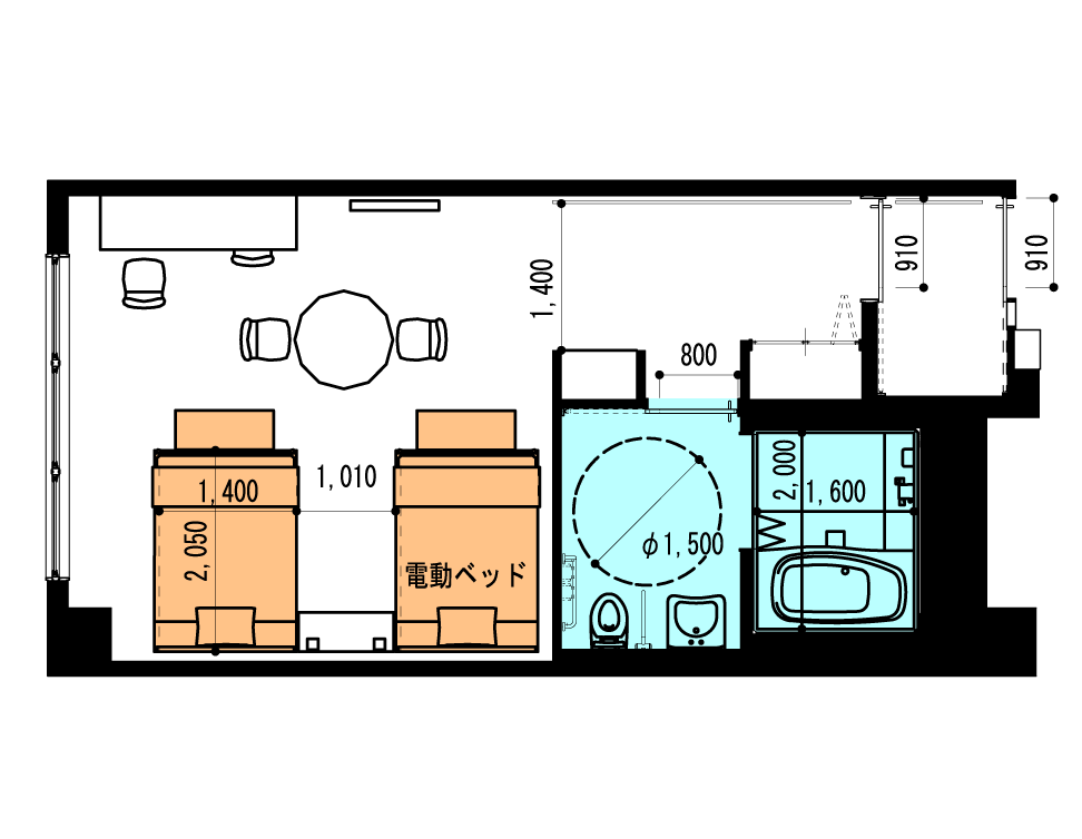 電動ベッド1台を用意しております。お部屋の広さは42㎡です。