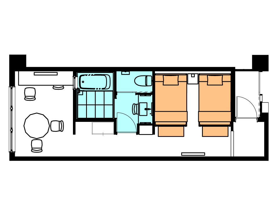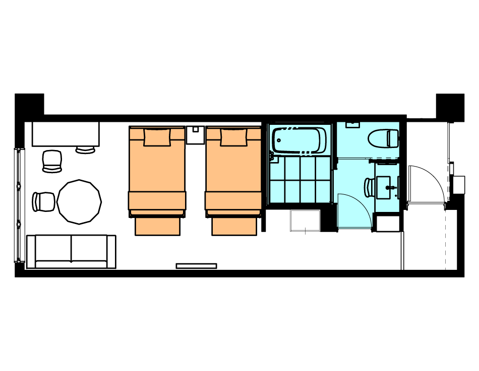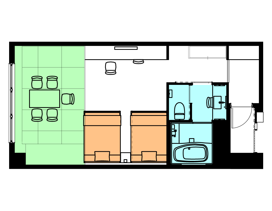 リビングとベッドスペースが一体となった広さ32㎡の洋室タイプのツインルームです。