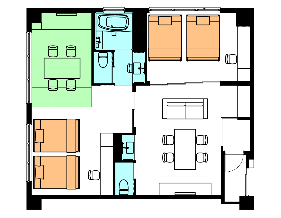ご家族やグループでのご滞在にも最適なゆとりのスペースと機能性を備え、最大2名様でのご利用が可能です。
