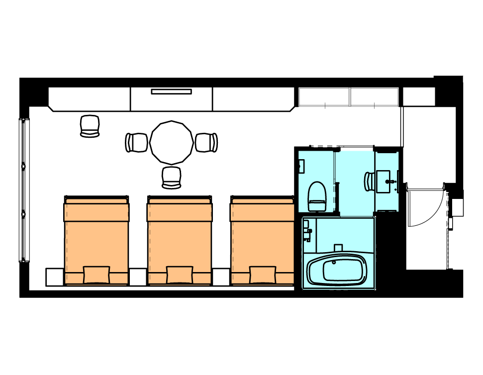 1400Wのベッド3台を恒常的にセットした広さ45㎡の3名様ご利用専用のお部屋です。