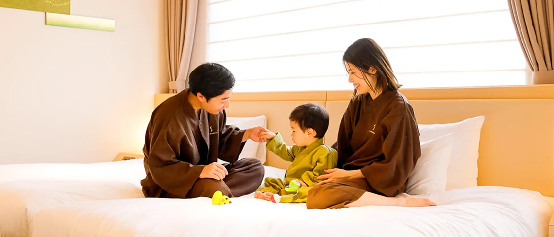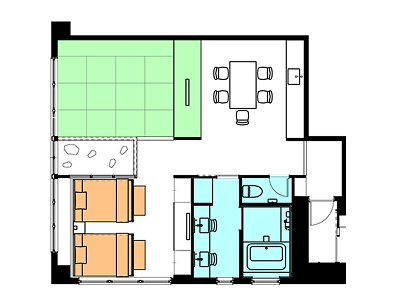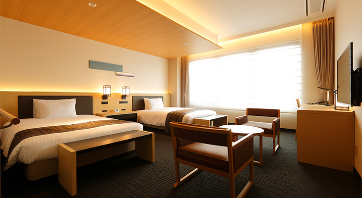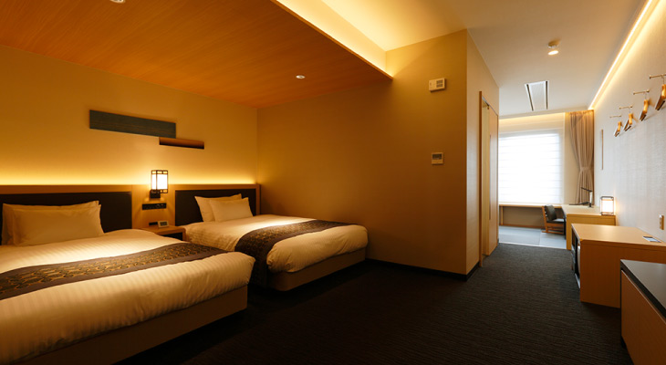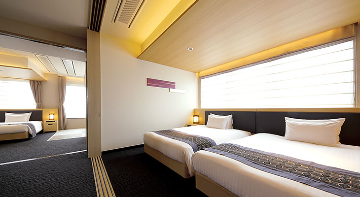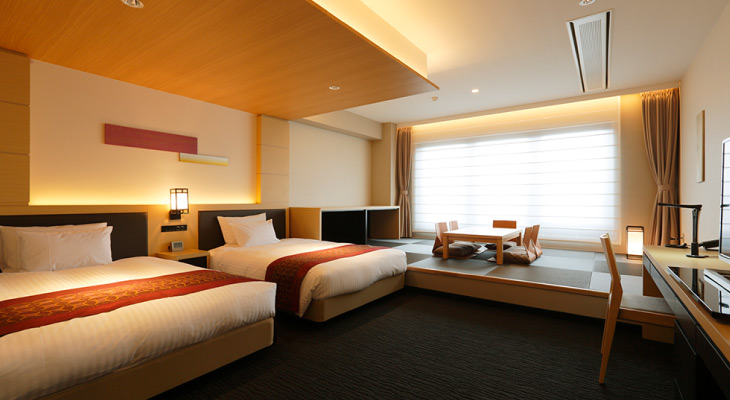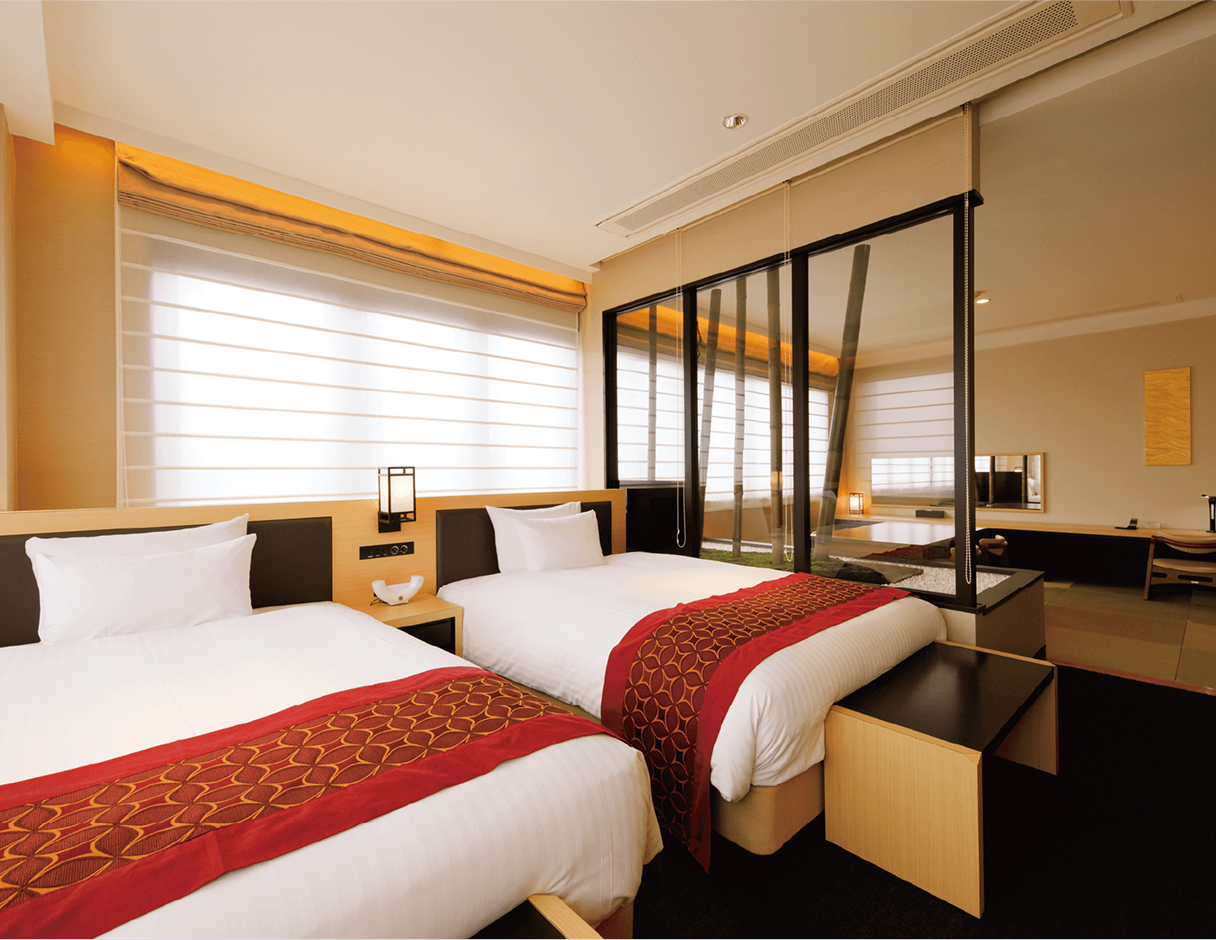 リビングとベッドスペースが一体となった広さ45㎡の和洋室タイプのツインルームです。