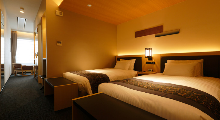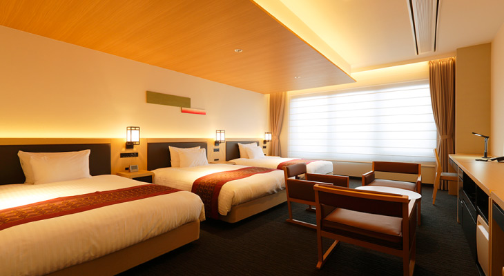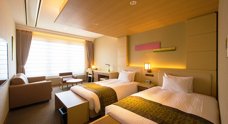 リビングとベッドスペースが独立した、広さ45㎡の和洋室タイプのツインルームです。