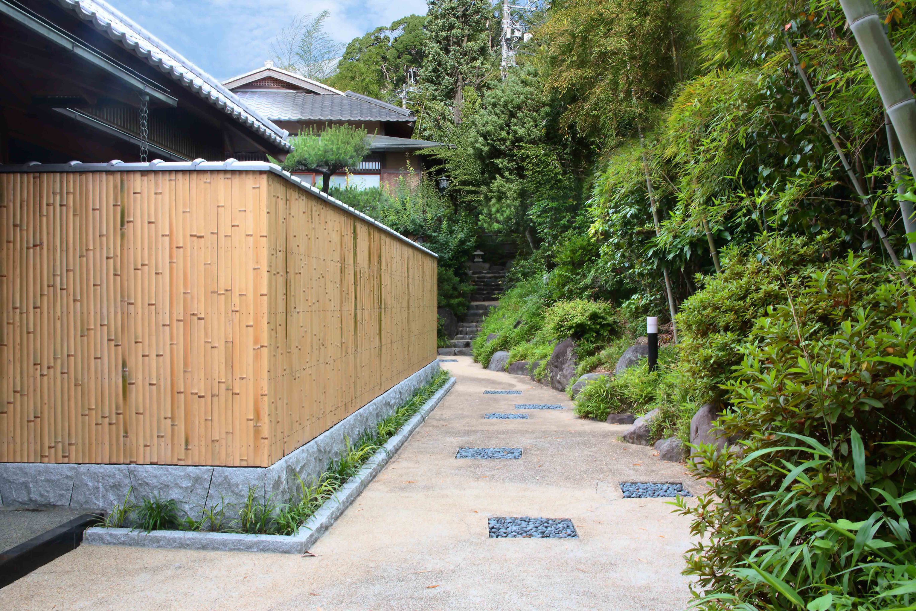 | 本館と離れを結ぶ散策路 源氏塀と竹林の間を通り抜け庭園へ |