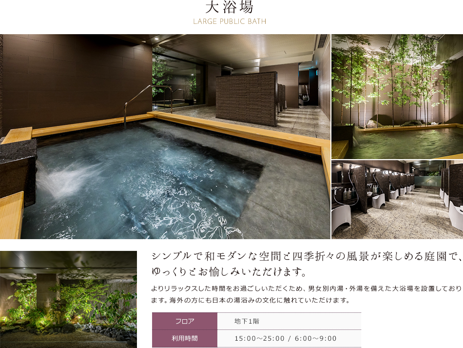 ホテルに居ながら京都滞在を満喫していただけるよう、館内は随所に和を感じられるつくりとなっており、四季折々の風景が愉しめる大浴場や、京野菜を使用したお食事の頂けるレストラン翠京がございます。また、快適なご滞在をサポートするための備品やサービスもご用意しておりますのでぜひご活用ください。