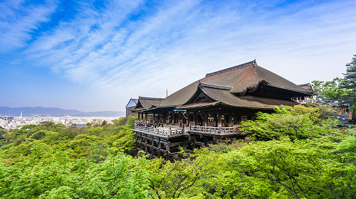 「清水の舞台」として有名な本堂(国宝)は、釘を一本も使わずに欅の大木を組み上げた伝統工法で支えられています。境内には、願いを叶える「音羽の滝」や、国内最大級の三重塔(重要文化財)など、30近い堂塔が並びます。