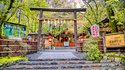 クヌギの木の皮を剥がさずにそのまま使用する、日本最古の鳥居形式「黒木鳥居」と、周囲を囲む「小柴垣」が平安時代の面影を伝えています。現在は、えんむすびや子宝安産の神様として、全国から多くの参拝客が訪れます。