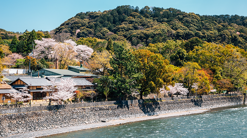 京都屈指の景勝地であり、古くから平安貴族の別荘地として愛されてきました。桜や紅葉の名所として全国的に有名です。