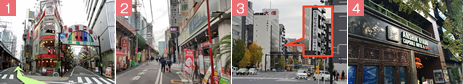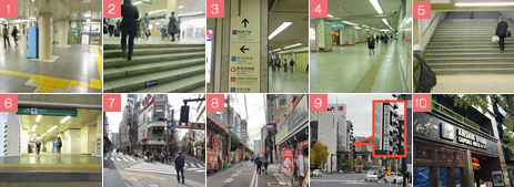 新橋店を右側に見ながらまっすぐ進み、大道路に出たら右に曲がります。
