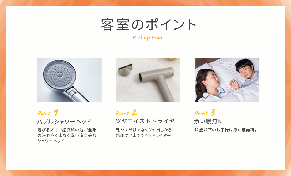 お子様連れのご家族や友人同士のご旅行におすすめです。広い客室でゆったりとおくつろぎください。無料インターネット接続も便利。添い寝のお子様は小学生まで無料で宿泊できます。
