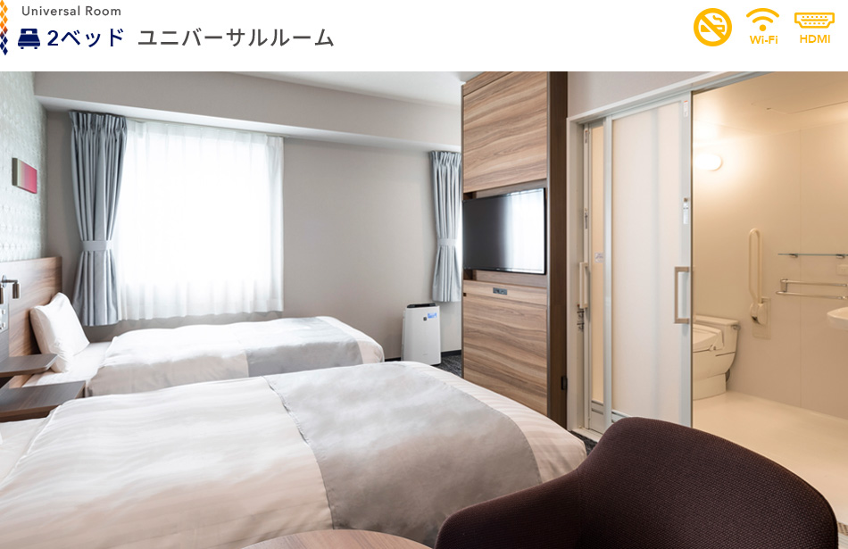 車いすをご利用のお客様も安心して宿泊できるバリアフリーの客室です。オリジナル快眠枕『チョイス ピロー』で気持ち良くお休みください。無料インター ネット接続も利用できます。※ユニバーサルルームは電話販売のみとなっております。ご利用される場合はホテルまでお問い合わせください。