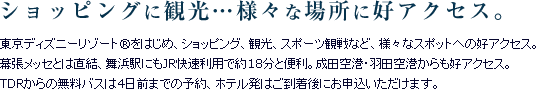 ホテルから約30分。ニューオータニ幕張は、東京ディズニーリゾート®のグッドネイバーホテルです。ホテル⇔リゾート間に無料のシャトルバスも運行しております。