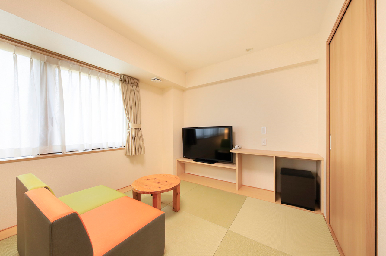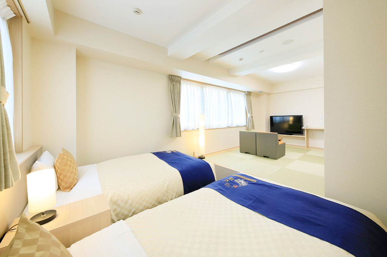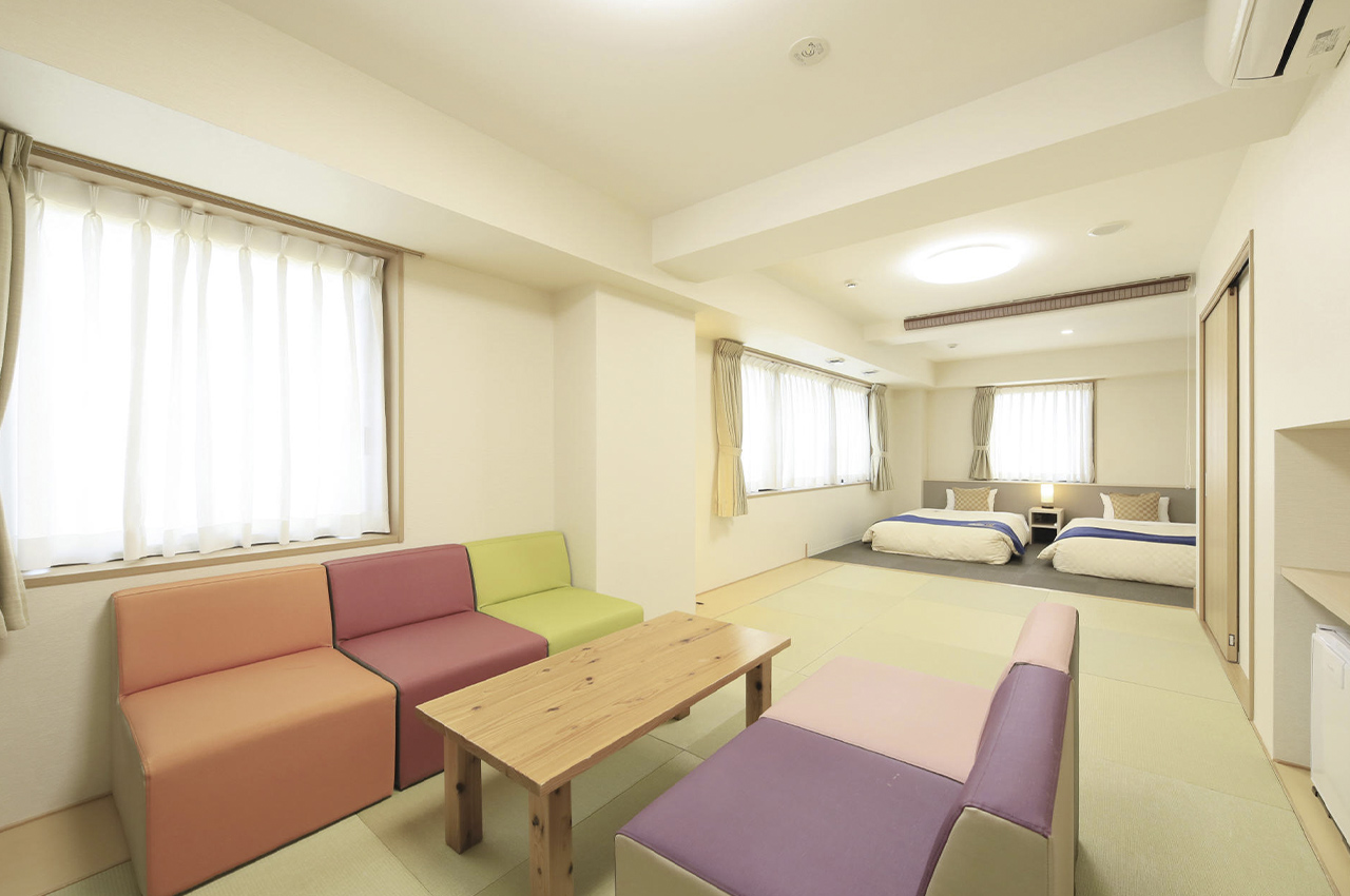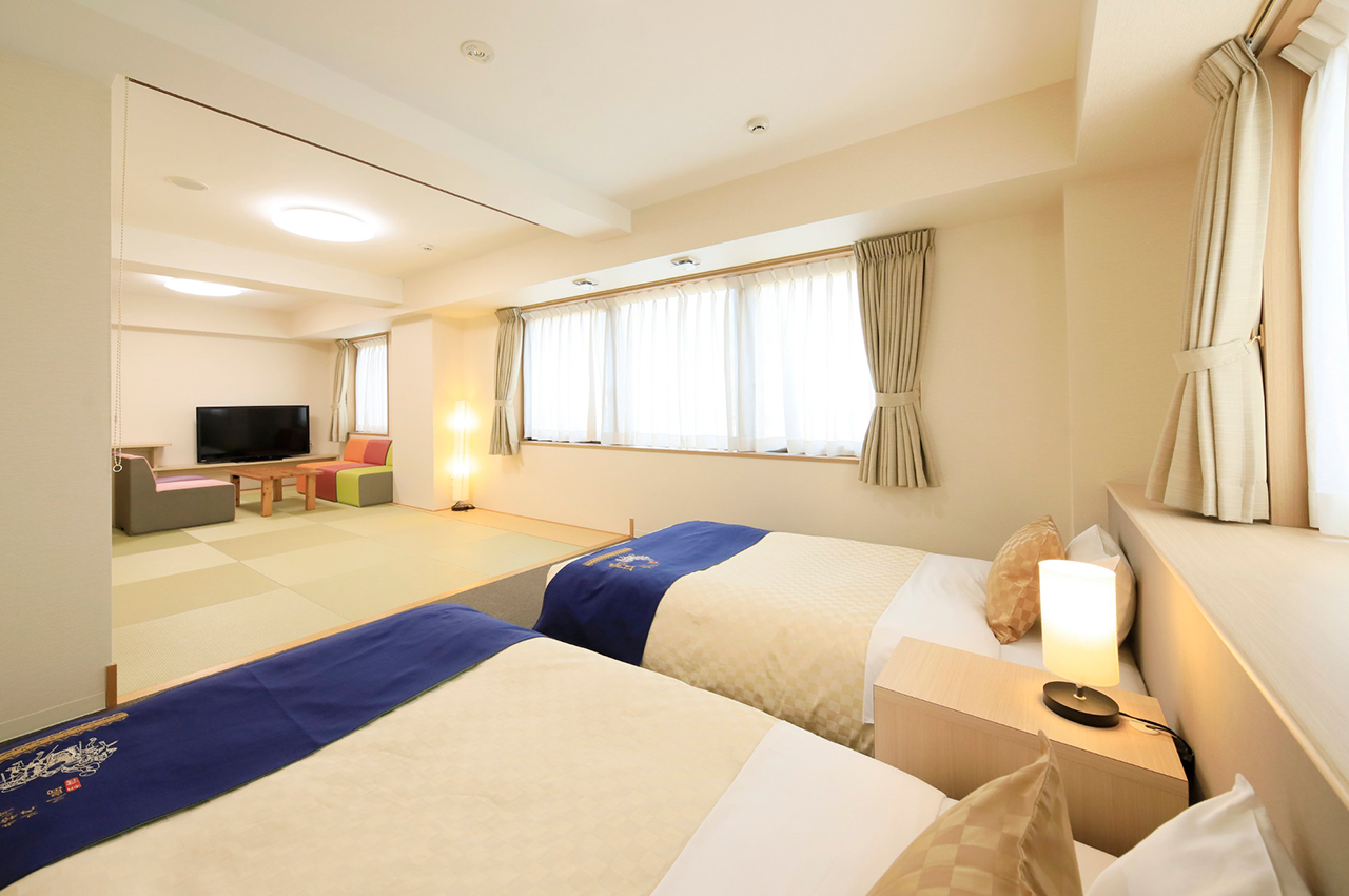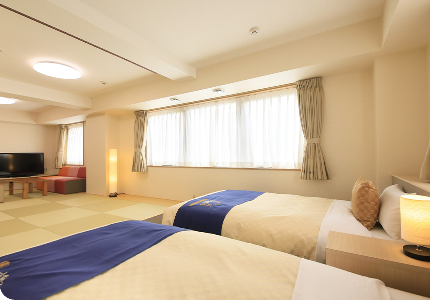 当ホテルの最上階にあり、三島エリアでは数少ない和室と洋室を掛け合わせたお部屋で、最大5名様までお泊り可能。ベッドは2つ(巾120㎝)あり、3名以上はお布団をご利用頂いております。テーブルセットもあり、靴を脱いで足を伸ばしてお寛ぎいただける為、お子様連れのご家族や、お仲間同士でのご利用に大変人気なお部屋です。和洋室より広く、バスルームとトイレが別になっております。