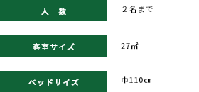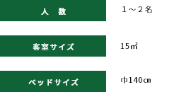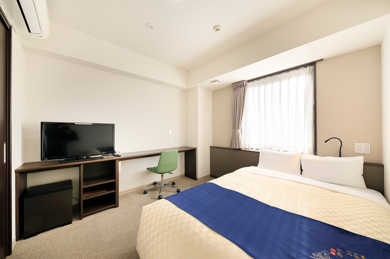 シモンズ製のダブルベッド(巾140㎝)を備え、観光やビジネスでの利用はもちろん、最大2名様で快適にお泊りいただけます。