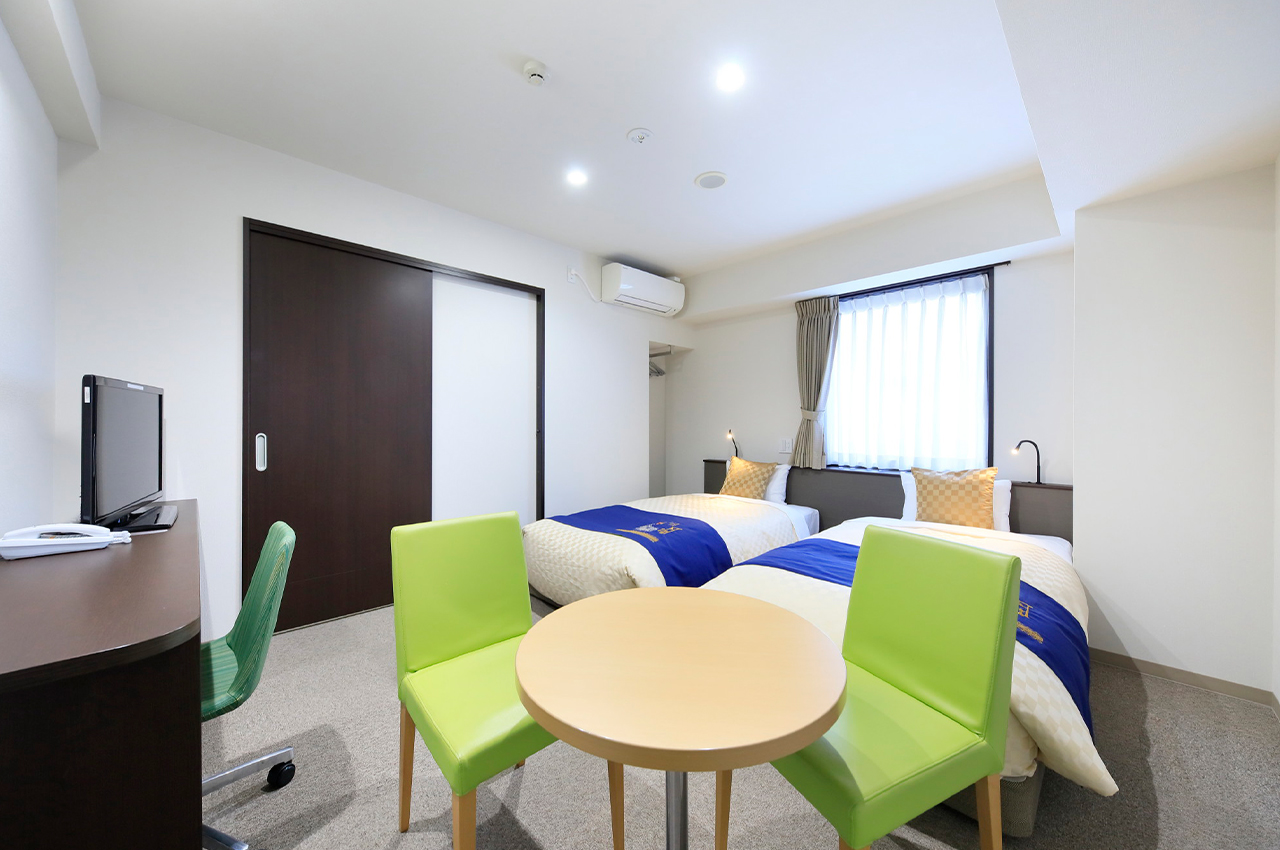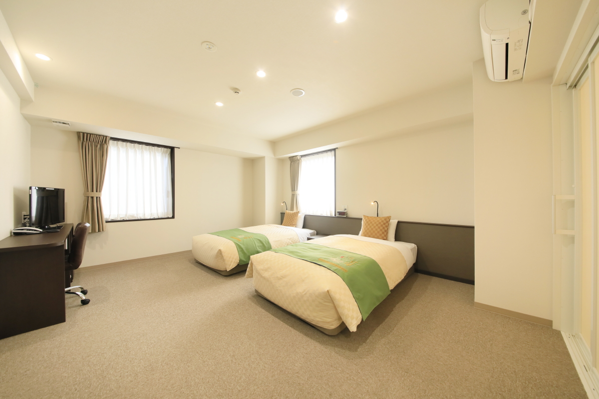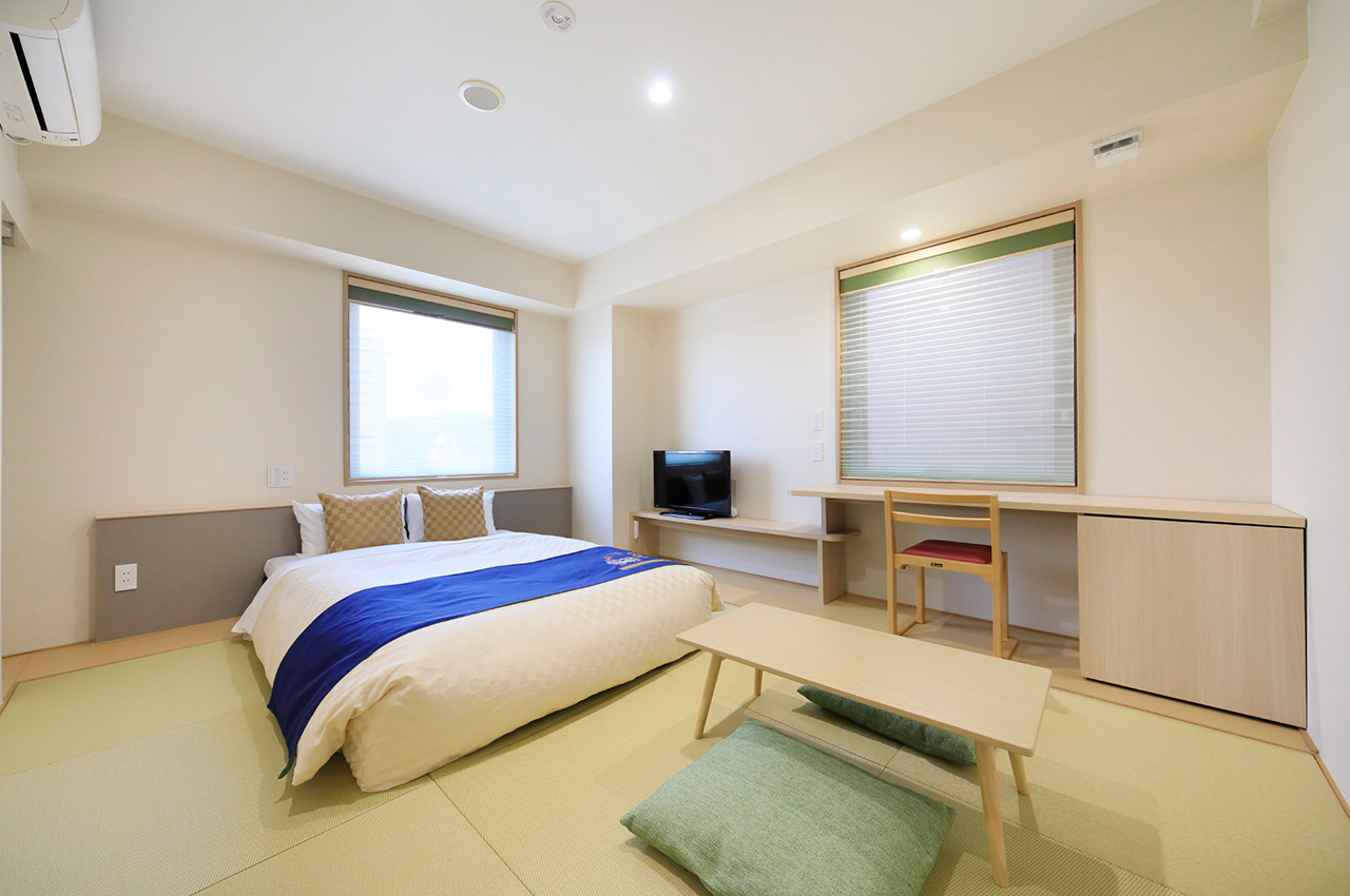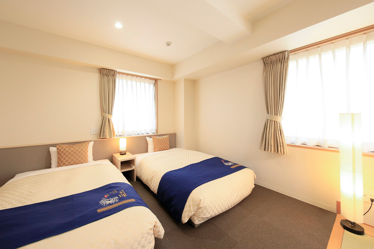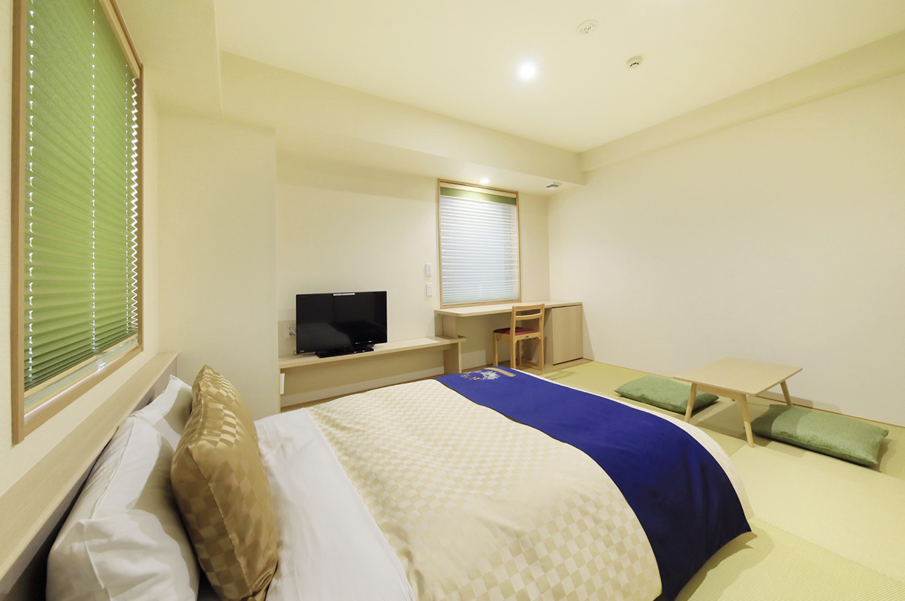 当ホテルの最上階にあり、三島エリアでは数少ない和室(4.5畳)と洋室を掛け合わせたお部屋で、最大4名までお泊り可能。ベッドは2つ(巾120㎝)あり、3名以上はお布団をご利用頂いております。