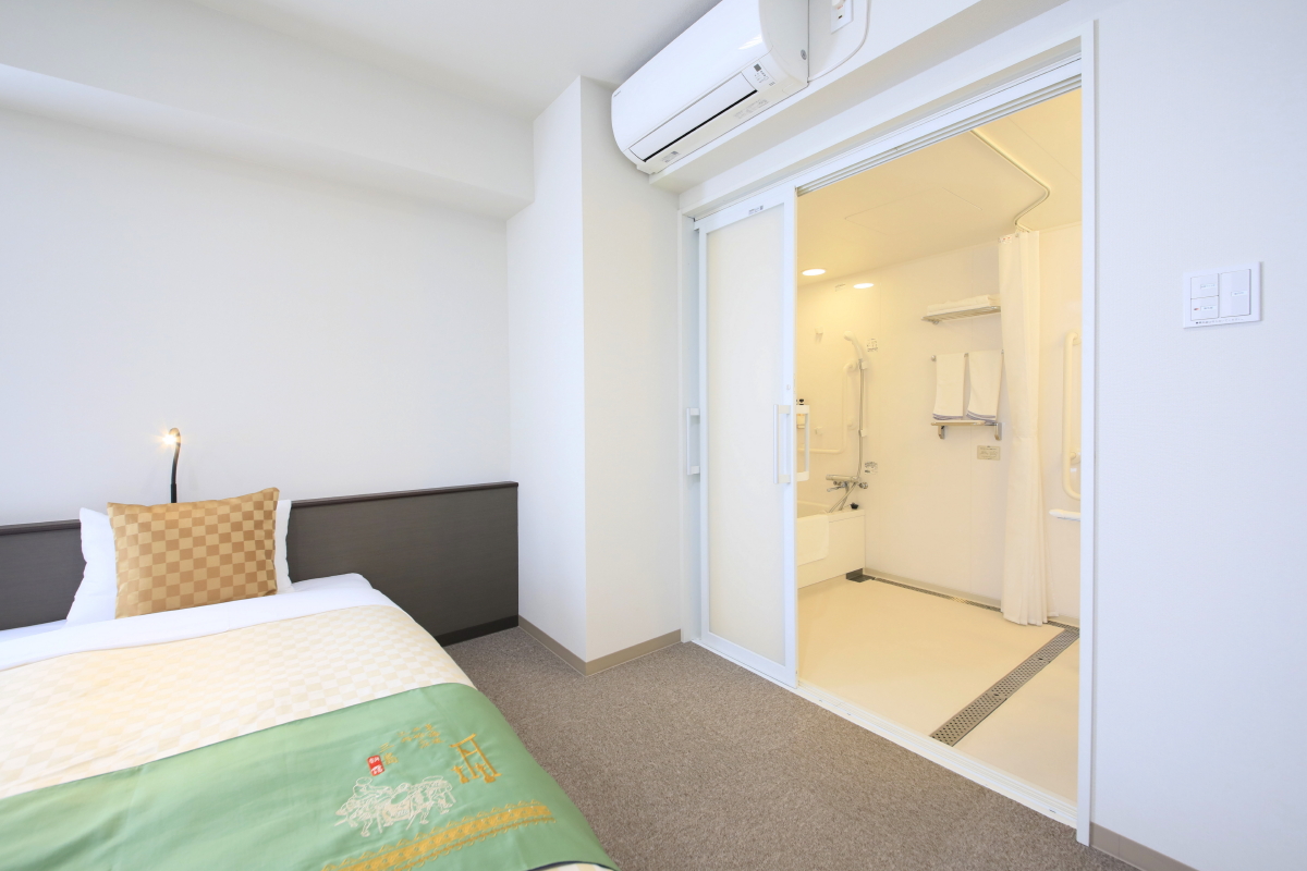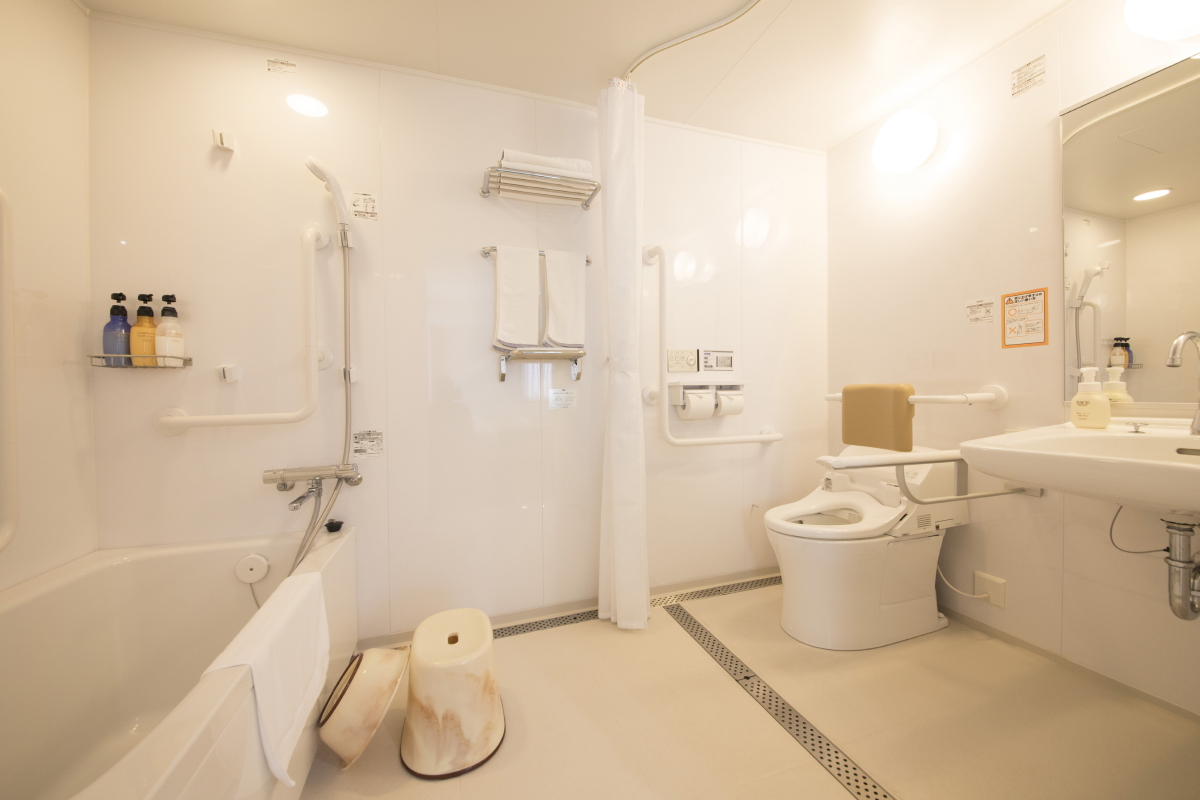 車椅子のお客様でもご宿泊出来るバリアフリーのお部屋。バリアフリー設計のユニットバスは段差が無く、手すりがあり安心です。介護用シャワーチェアも用意あり。ベッドは2つ(巾110cm)あり、ユニットバスへの導線もスムーズです。