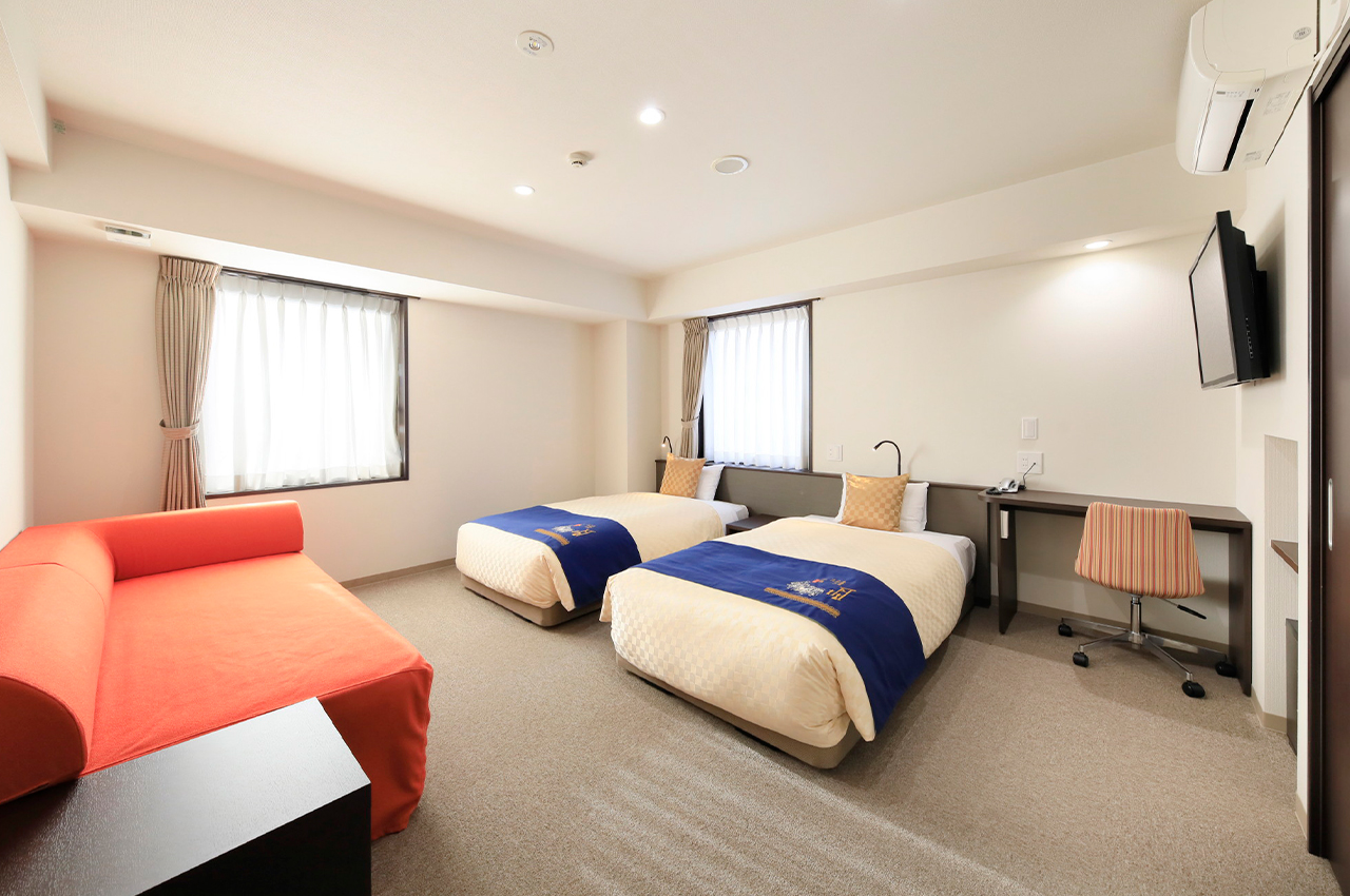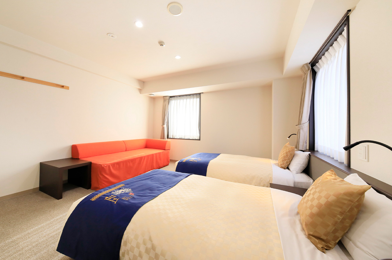 シングルベッド2台とソファを備えたお部屋です。ソファはベッドにすることで最大3名様でお泊りいただけます。バスルームとトイレが別の人気のお部屋となっております。
