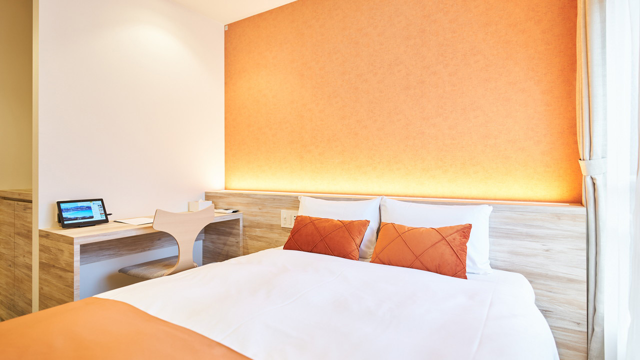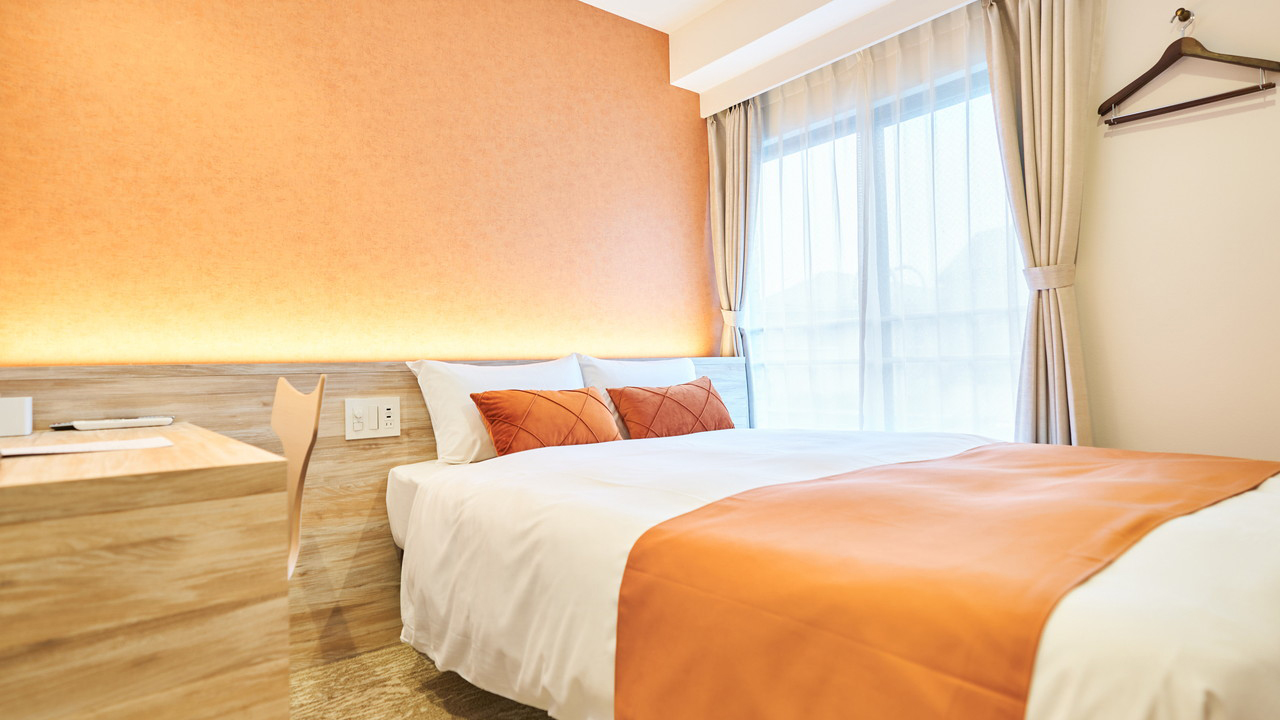 すっきりとしたシンプルなデザインが魅力のダブルベッドルームです。220cm幅の広々としたベッドを1台配置しており、シングルユースでもゆったりとおくつろぎいただけます。また、ワークデスクを完備しているため、ビジネス利用はもちろん、観光での滞在にも最適です。※ベッドの追加は承っておりません。幼児のお子様は添い寝でのご利用が可能です。定員:1~2名広さ:14~15.2㎡ベッドサイズ:W 140cm×195cm ×1台