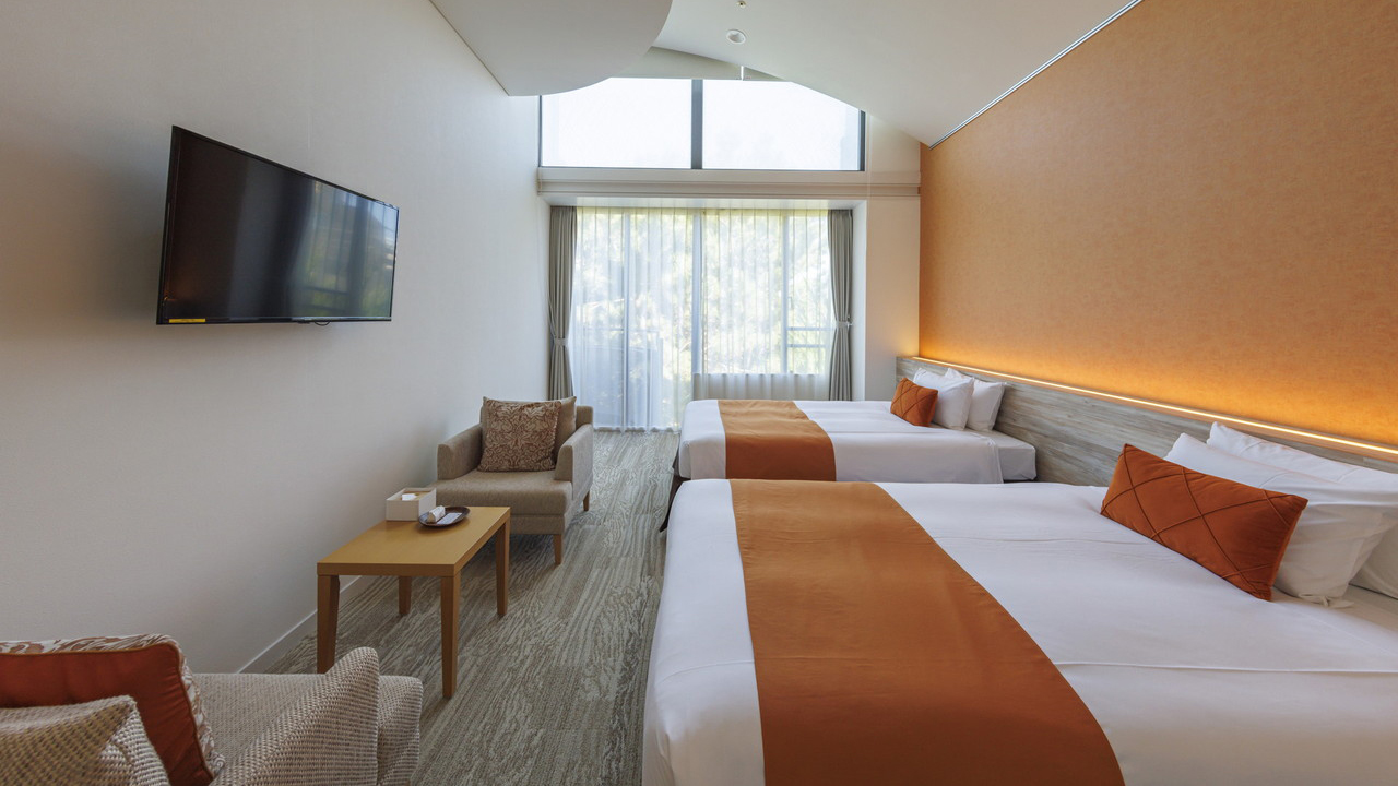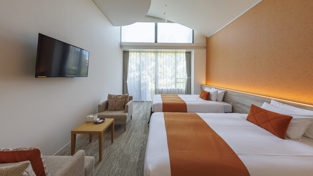 天井が高く、広々とした空間が魅力のシンプルで落ち着いたデラックスツインルームAです。120cm幅のセミダブルサイズベッドを2台配置しており、カップルやご夫婦、ご友人同士、ご家族で快適にお過ごしいただけます。また、エキストラベッドを1台追加可能で、最大3名様までご利用いただけます。定員:1~3名広さ:38.65㎡ベッドサイズ:W 120cm×195cm ×2台