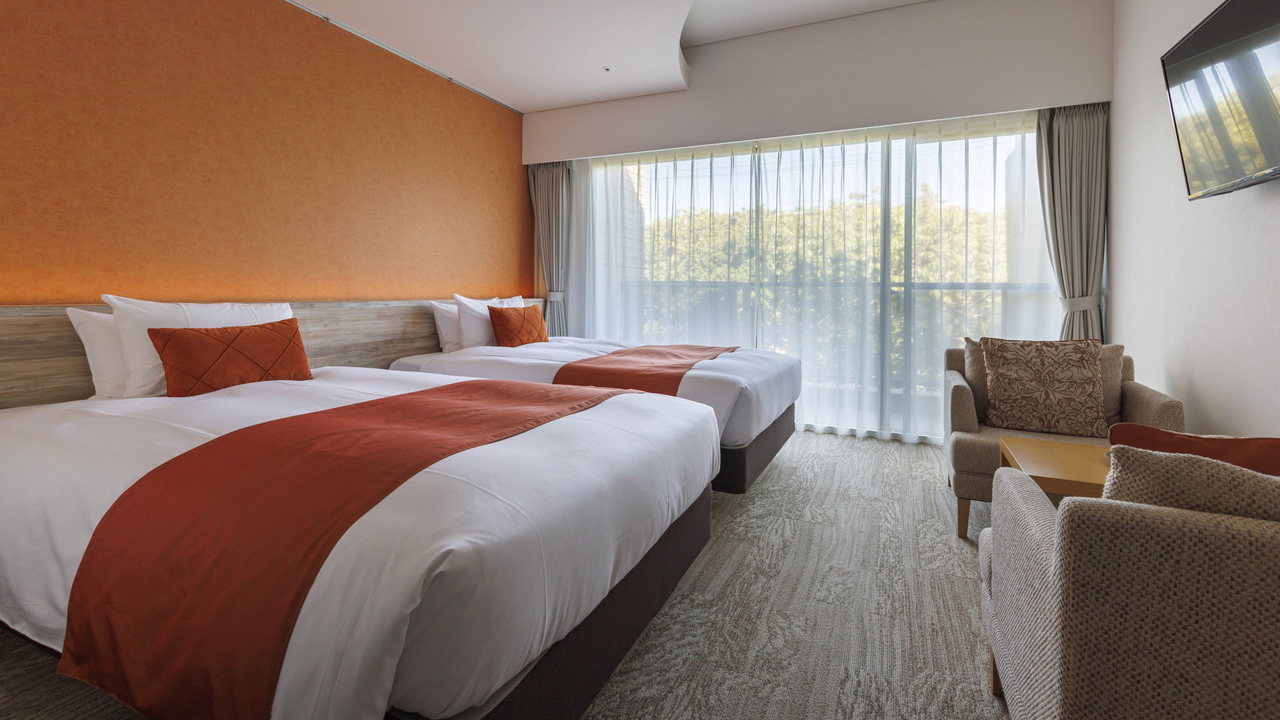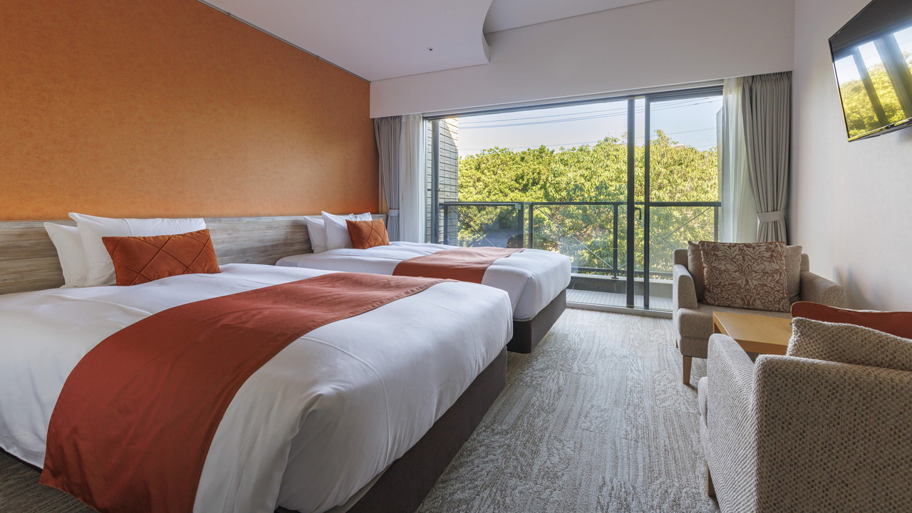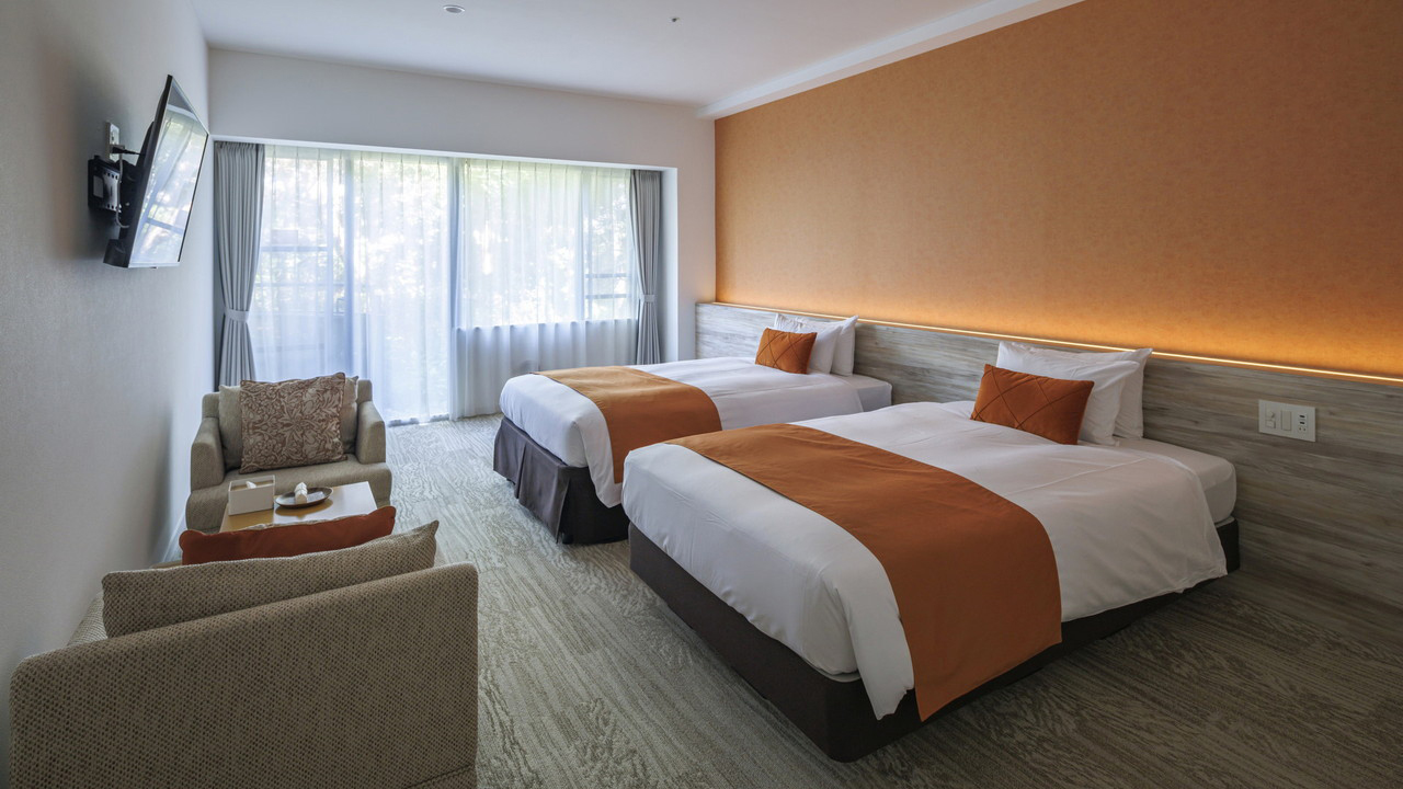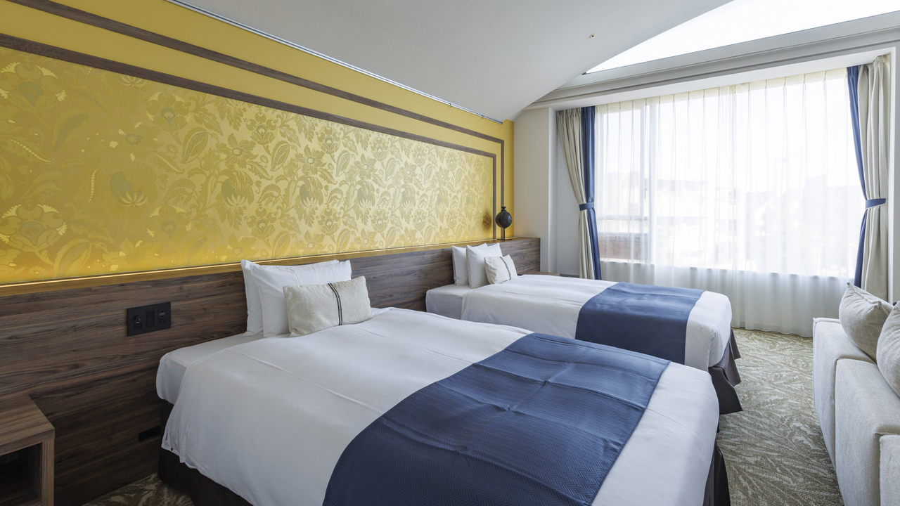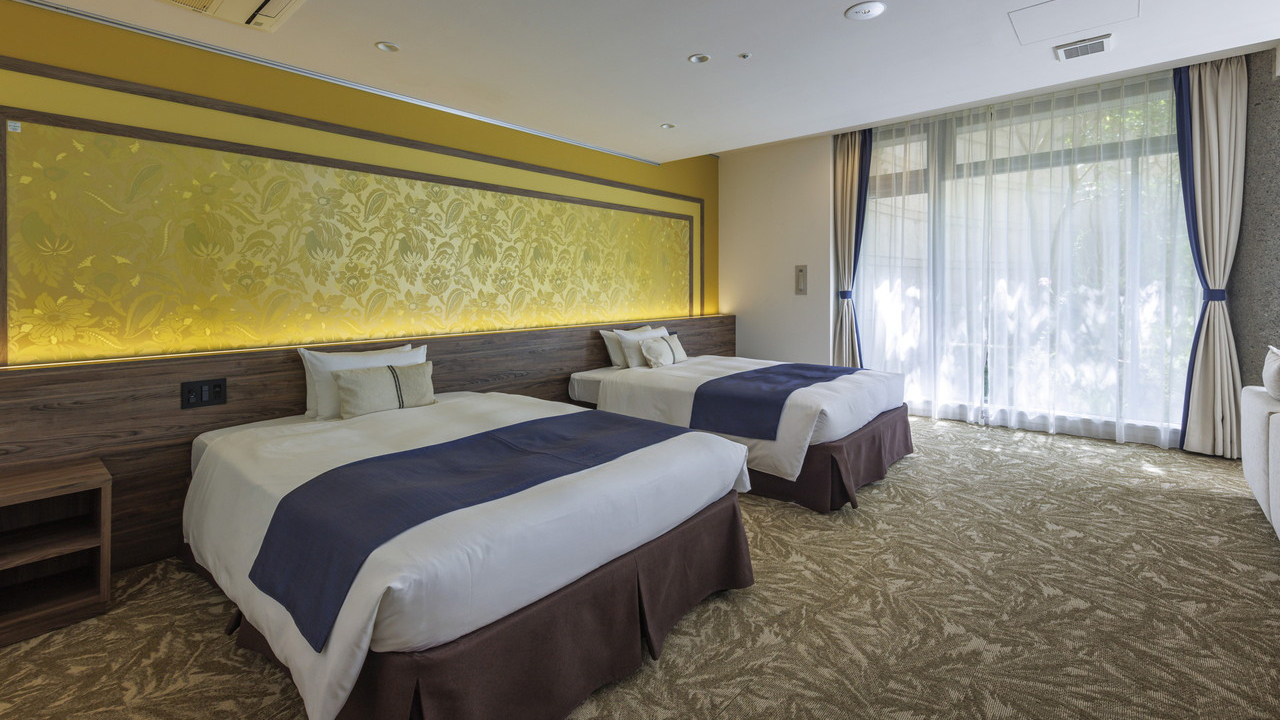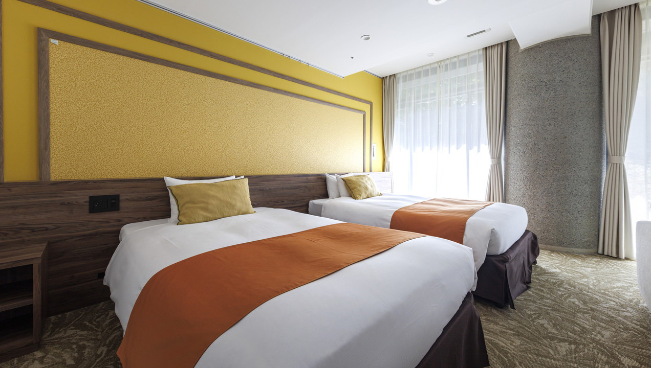 すっきりと落ち着いた雰囲気が魅力のシンプルなツインルームです。120cm幅のセミダブルサイズのベッドを2台配置しており、カップルやご夫婦、ご友人同士、親子でのご滞在にぴったりです。ビジネス利用はもちろん、観光でのご利用にもおすすめです。定員:1~2名広さ:26~30㎡ベッドサイズ:W 120cm×195cm ×2台