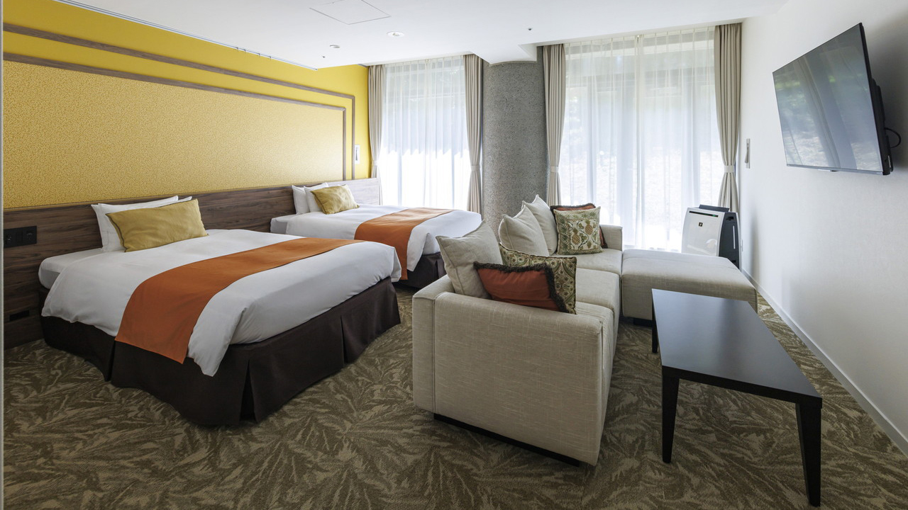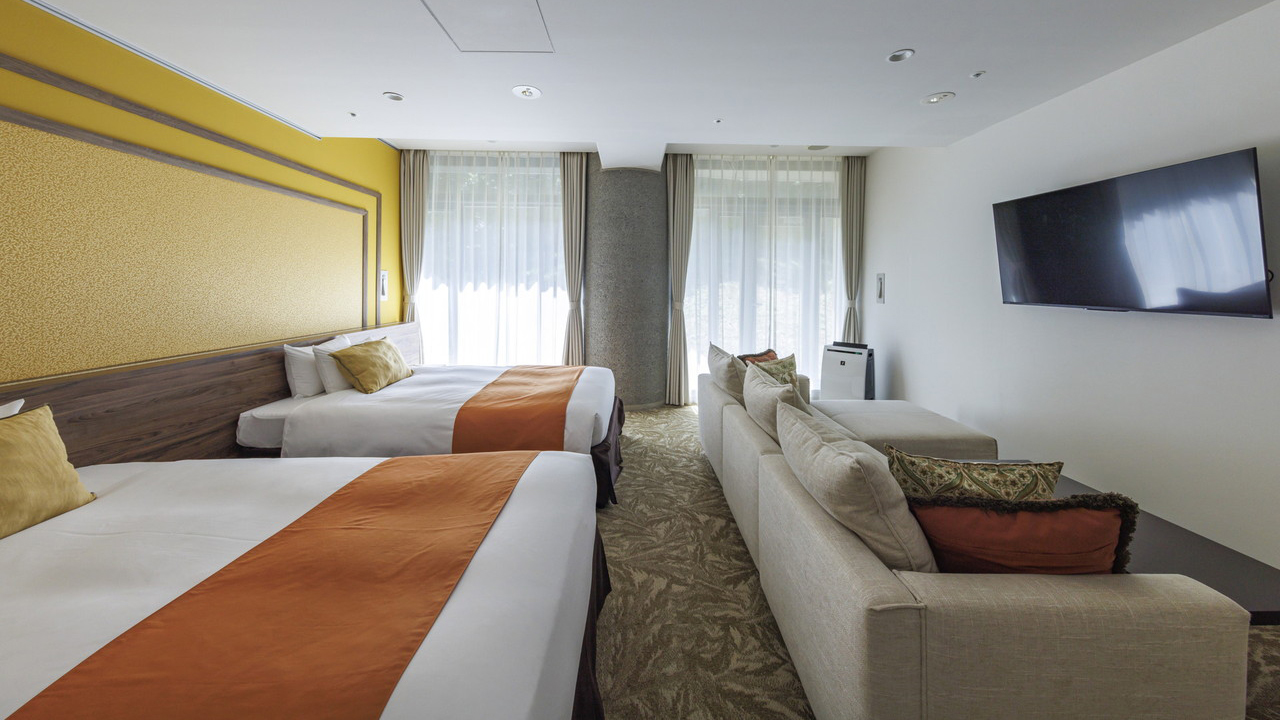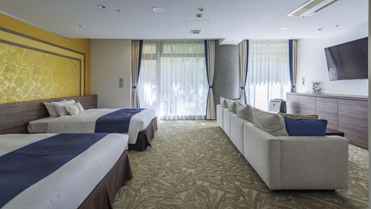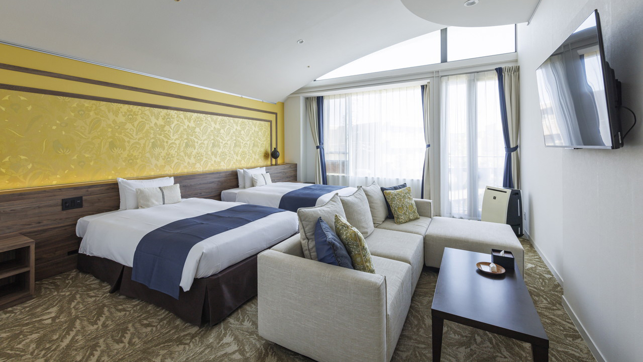 洗練されたインテリアと広々とした空間が魅力のプレミアムツインルームです。リビングルームにはゆったりとしたソファとコーヒーテーブルを備えており、読書や団らんのひとときをお楽しみいただけます。エキストラベッドを最大2台まで追加可能で、最大4名様までご利用いただけます。洗面台を2台完備し、足を伸ばしてくつろげる大きなバスタブもご用意しております。ご友人同士やご家族で気軽にお過ごしいただけます。まるで暮らすような快適さをご堪能ください。定員:1~4名広さ:59㎡ベッドサイズ:W 140cm×195cm ×2台