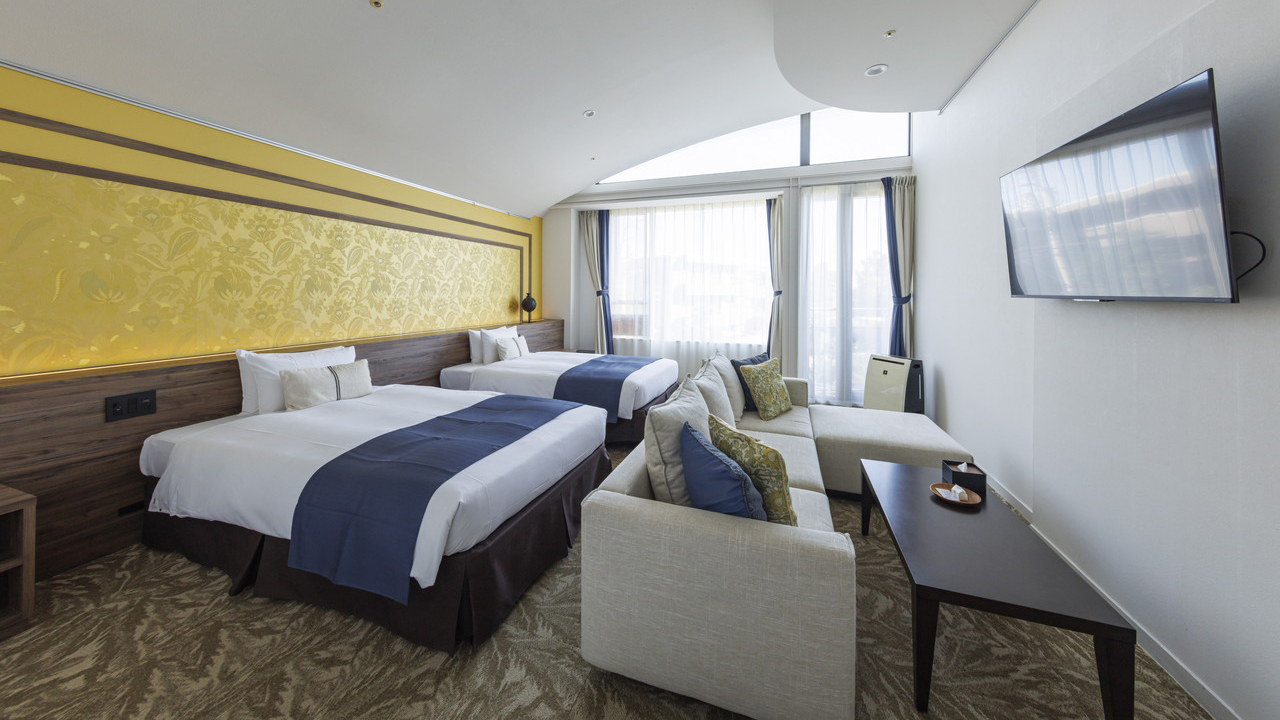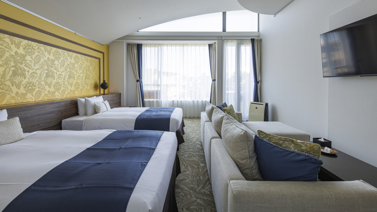 大きな窓からたっぷりと陽光が差し込む、明るく広々とした空間が魅力のエグゼクティブツインルームです。エキストラベッドを最大2台まで追加可能で、最大4名様までご利用いただけます。洗面台を2台完備し、足を伸ばしてリラックスできる大きなバスタブもご用意しております。ご友人同士やご家族で気軽にお過ごしいただけます。まるで暮らすような快適さをご堪能ください。定員:1~4名広さ:55㎡ベッドサイズ:W 120cm×195cm ×2台