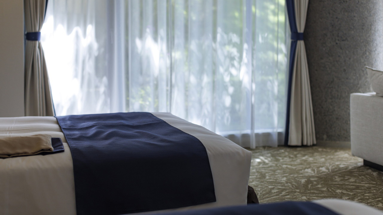 天井が高く広々とした空間が魅力のシンプルなスーペリアツインルームです。120cm幅のセミダブルサイズのベッドを2台配置しており、カップルやご夫婦、ご友人同士、親子で気軽にお過ごしいただけます。また、エキストラベッドを1台追加可能で、最大3名様までご利用いただけます。定員:1~3名広さ:30~34㎡ベッドサイズ:W 120cm×195cm ×2台