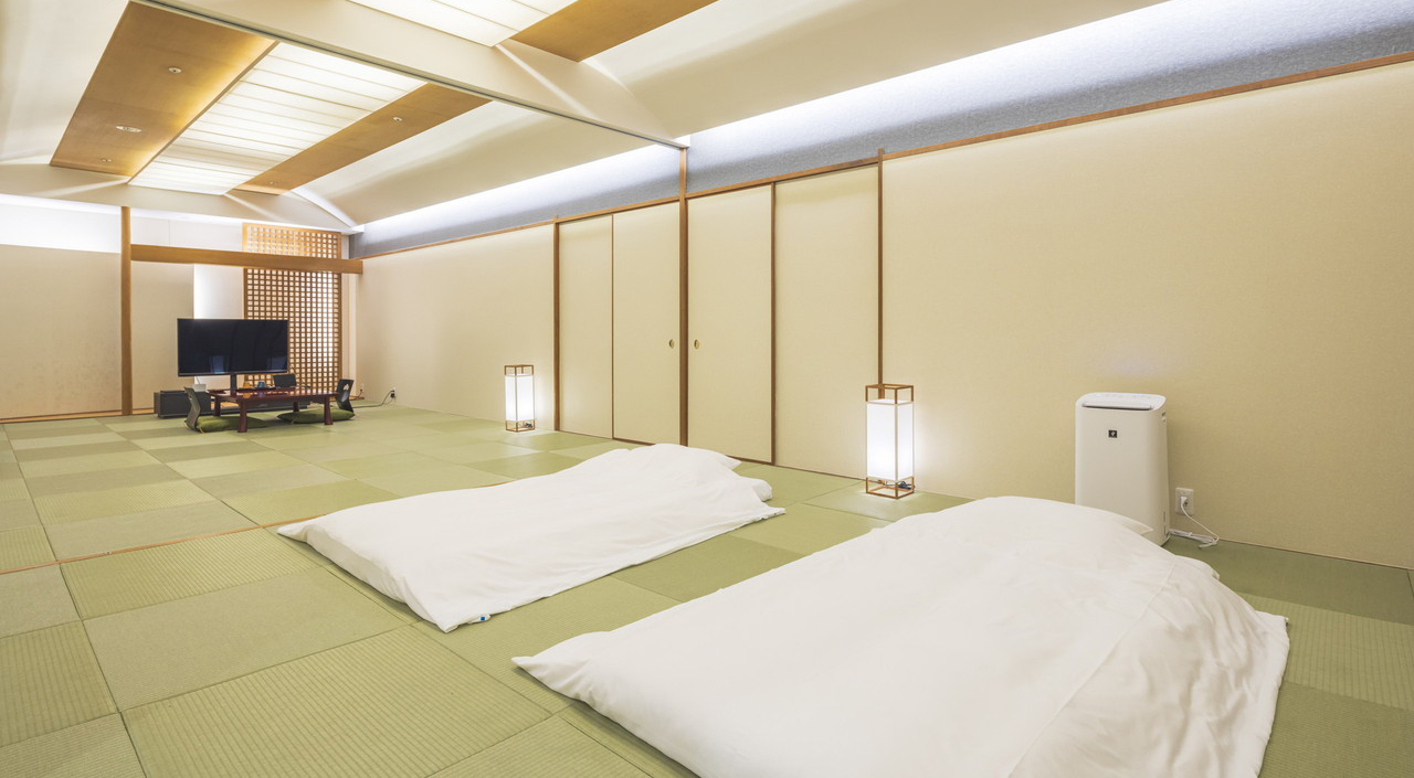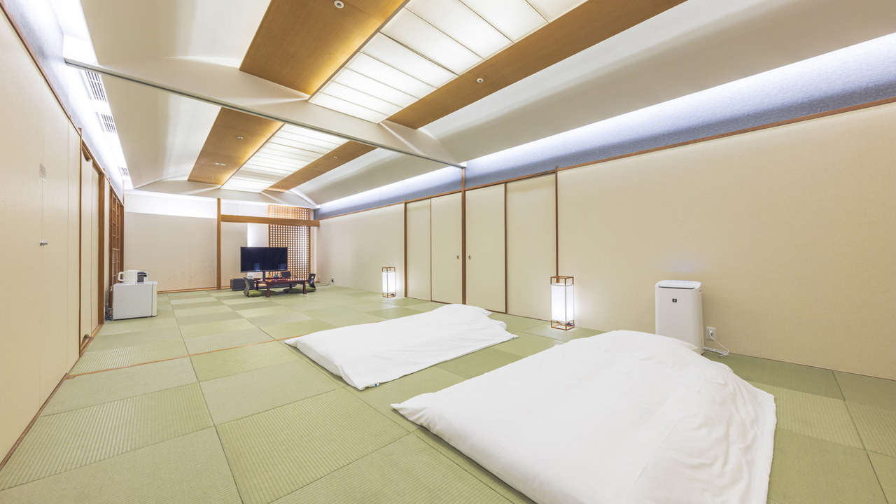 60㎡の広々とした畳敷きのお部屋です。シングルサイズの布団を6セットご用意しておりますので、大人数での婦ループ旅行やご家族での団らんに最適です。室内には洗面台とお手洗いを完備しておりますが、シャワーおよびバスタブはございません。お風呂は大浴場をご利用ください。定員:1~6名広さ:60㎡布団サイズ:W 95cm×195cm ×6セット