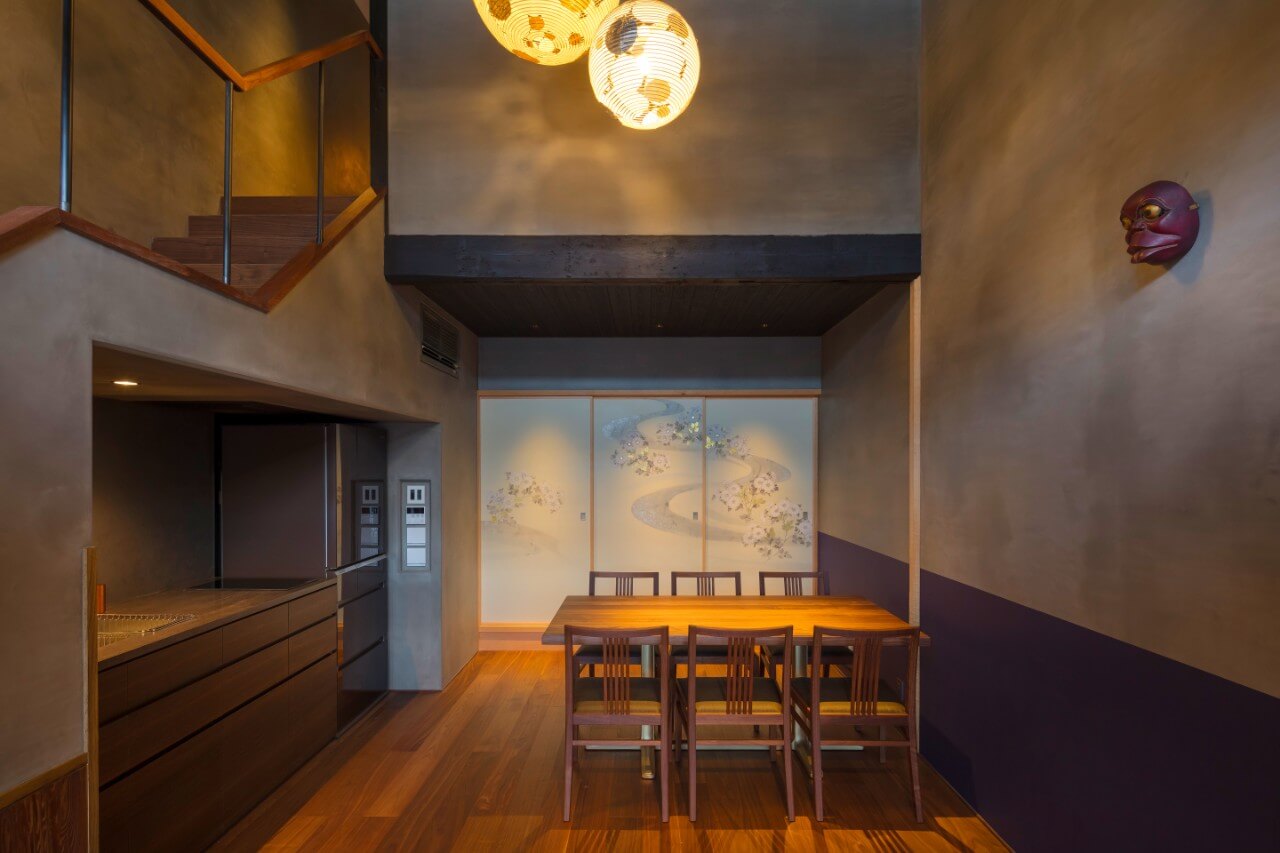 襖絵師島田由子氏による「優り草=菊」の襖が彩ります。壁面に1枚の大判陶版を使用したキッチンは調理器具やIHコンロ付きで自炊も可能。
