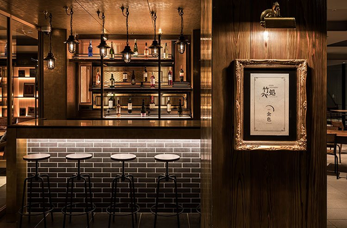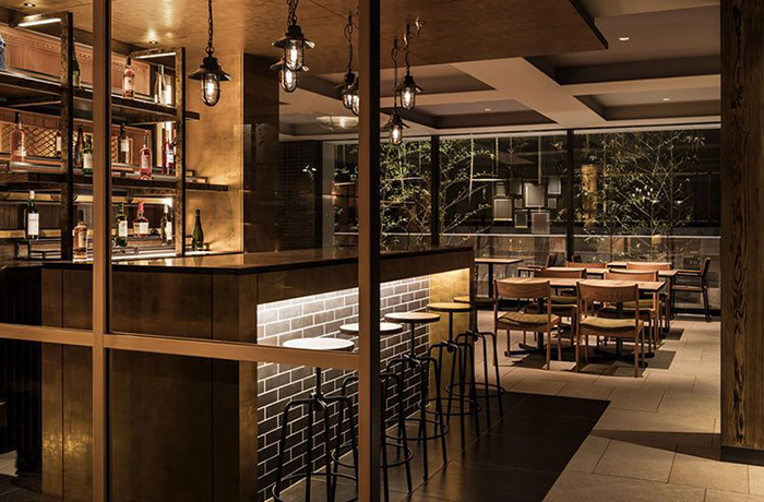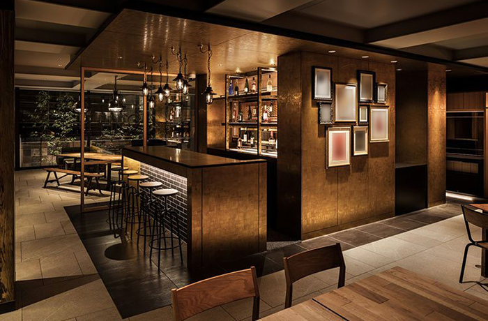 半地下のエントランス空間に併設されたBAR「KONJIKI 金色」。カウンターで静かにグラスを傾けるもよし、テーブル席でリラックスして楽しむもよし。それぞれの寛ぎの時間をお愉しみください。