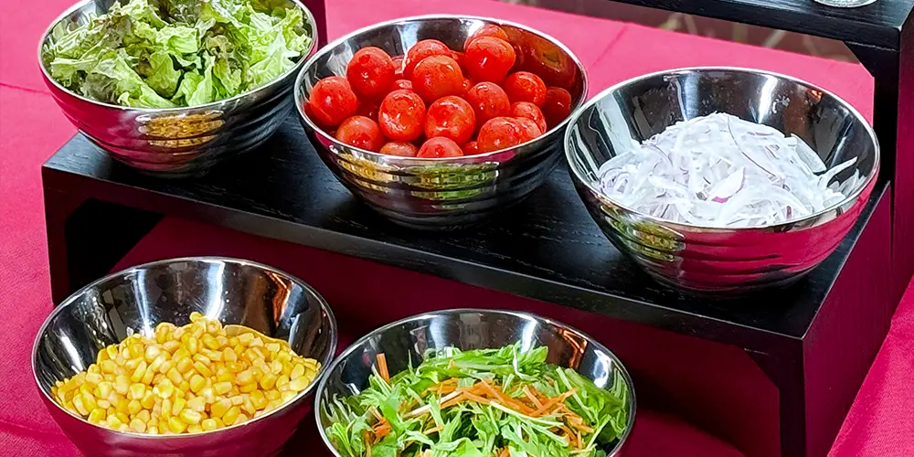 その日の新鮮な野菜を中心に、ベーコンやフライドオニオンなど多彩なトッピングをご用意。お好みの組み合わせをお楽しみください。