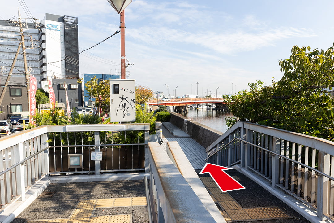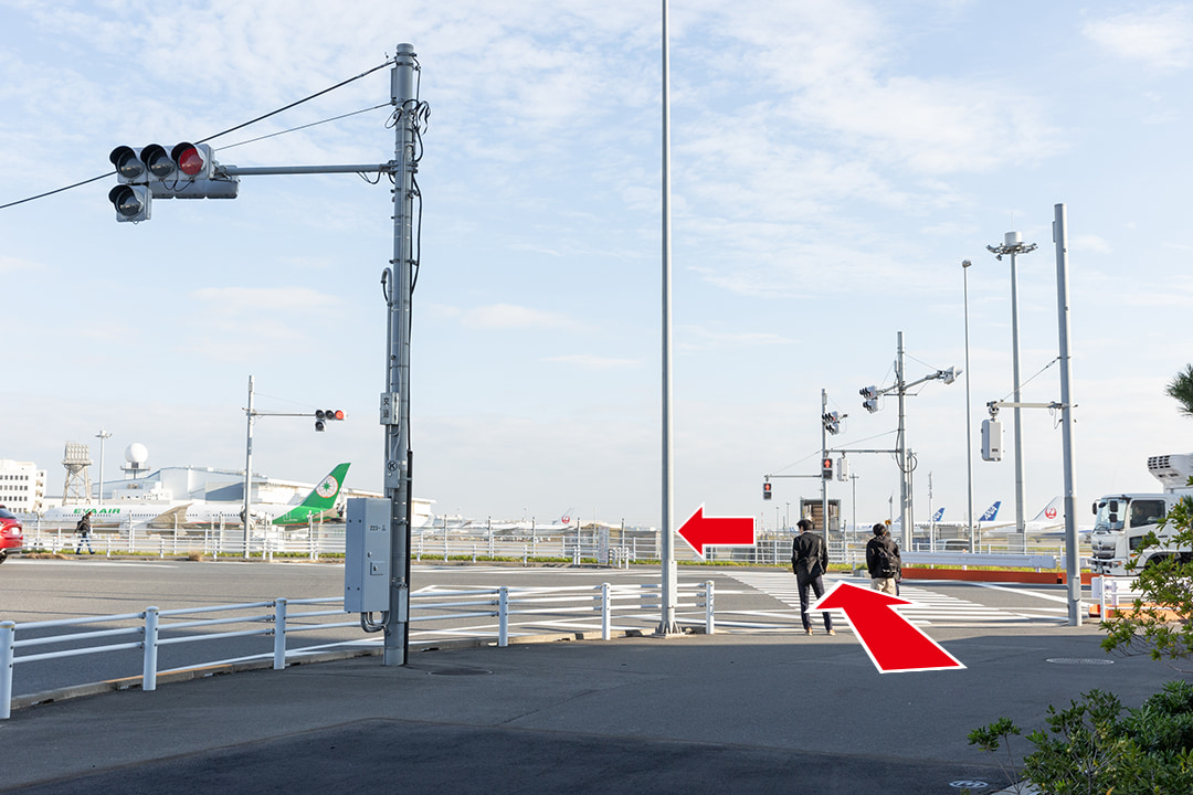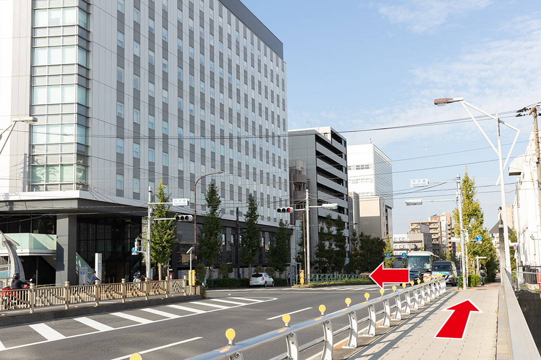 穴守橋を直進し、ホテル前の横断歩道を渡ってください。